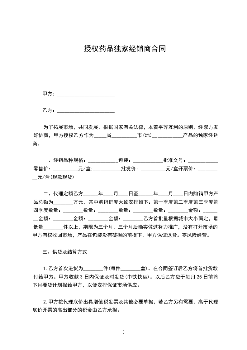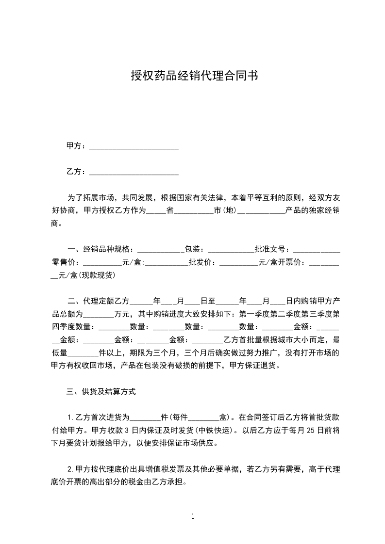 1.乙方首次进货为________件(每件________盒)。在合同签订后乙方将首批货款付给甲方。甲方收款 日内保证及时发货(中铁快运)。以后乙方应于每月 日前将下月要货计划报给甲方,以便安排保证市场供应。