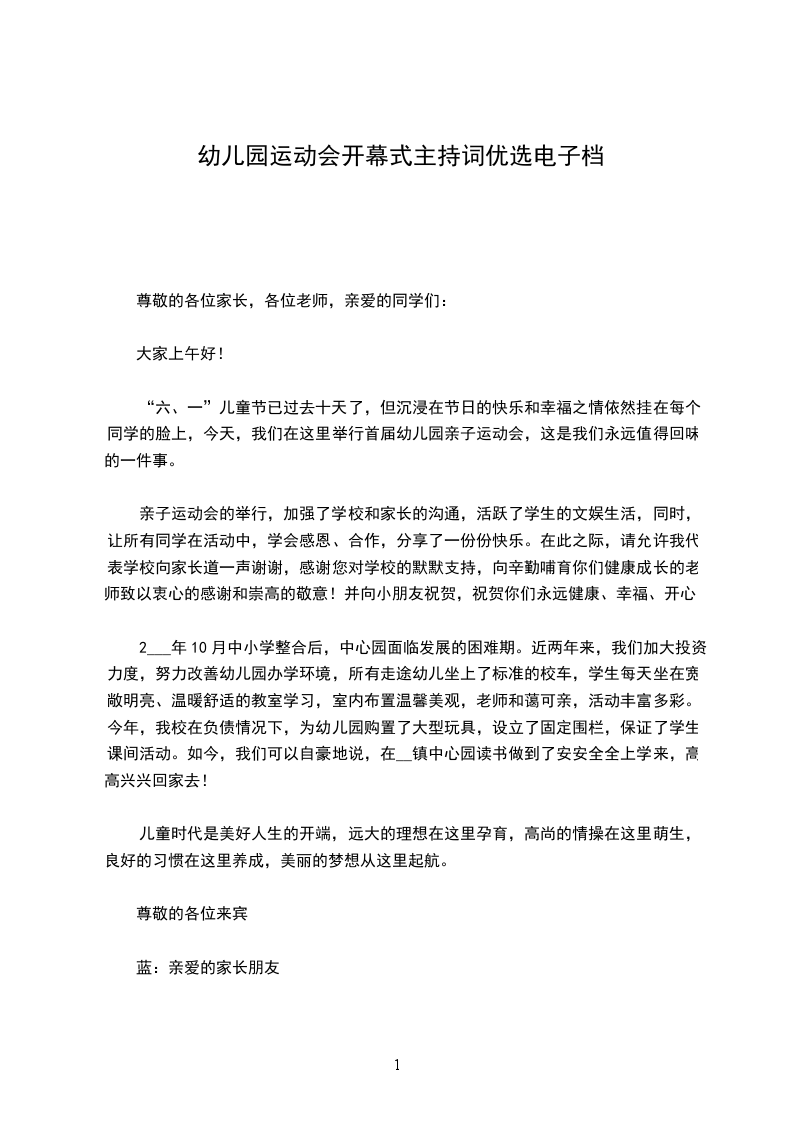 亲子运动会的举行,加强了学校和家长的沟通,活跃了学生的文娱生活,同时,让所有同学在活动中,学会感恩、合作,分享了一份份快乐。在此之际,请允许我代表学校向家长道一声谢谢,感谢您对学校的默默支持,向辛勤哺育你们健康成长的老师致以衷心的感谢和崇高的敬意!并向小朋友祝贺,祝贺你们永远健康、幸福、开心!