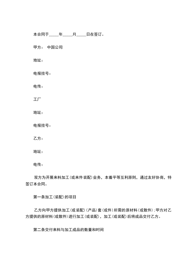 双方为开展来料加工(或来件装配)业务,本着平等互利原则,通过友好协商,特签订本合同。