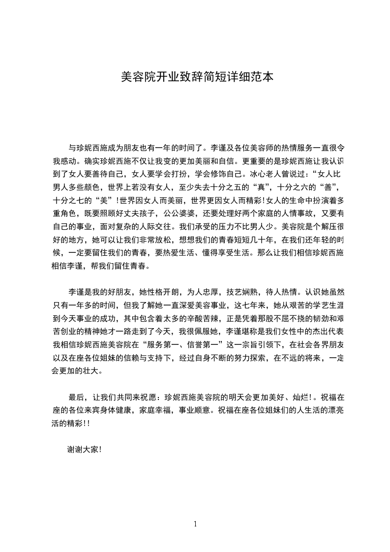 李谨是我的好朋友,她性格开朗,为人忠厚,技艺娴熟,待人热情。认识她虽然只有一年多的时间,但我了解她一直深爱美容事业,这七年来,她从艰苦的学艺生涯到今天事业的成功,其中包含着太多的辛酸苦辣,正是凭着那股不屈不挠的韧劲和艰苦创业的精神她才一路走到了今天,我很佩服她,李谨堪称是我们女性中的杰出代表。我相信珍妮西施美容院在“服务第一、信誉第一”这一宗旨引领下,在社会各界朋友以及在座各位姐妹的信赖与支持下,经过自身不断的努力探索,在不远的将来,一定会更加的壮大。