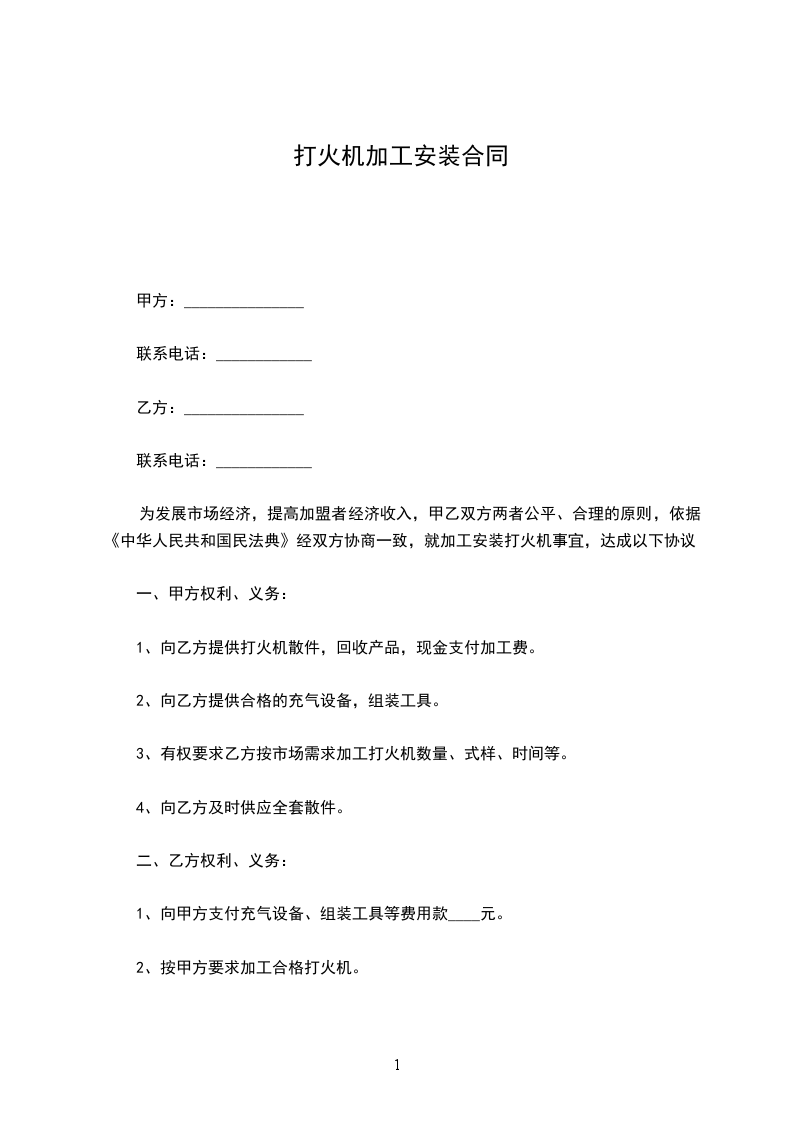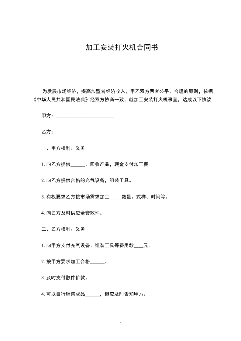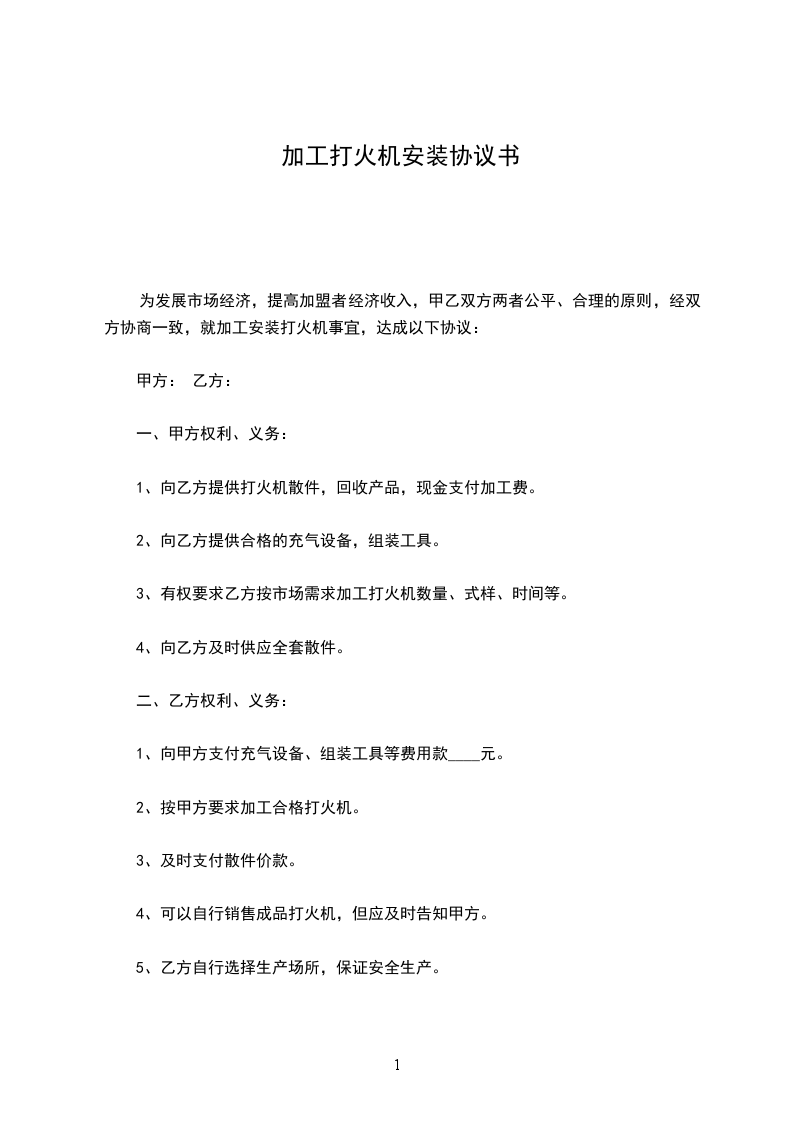 为发展市场经济,提高加盟者经济收入,甲乙双方两者公平、合理的原则,依据《中华人民共和国民法典》经双方协商一致,就加工安装打火机事宜,达成以下协议: