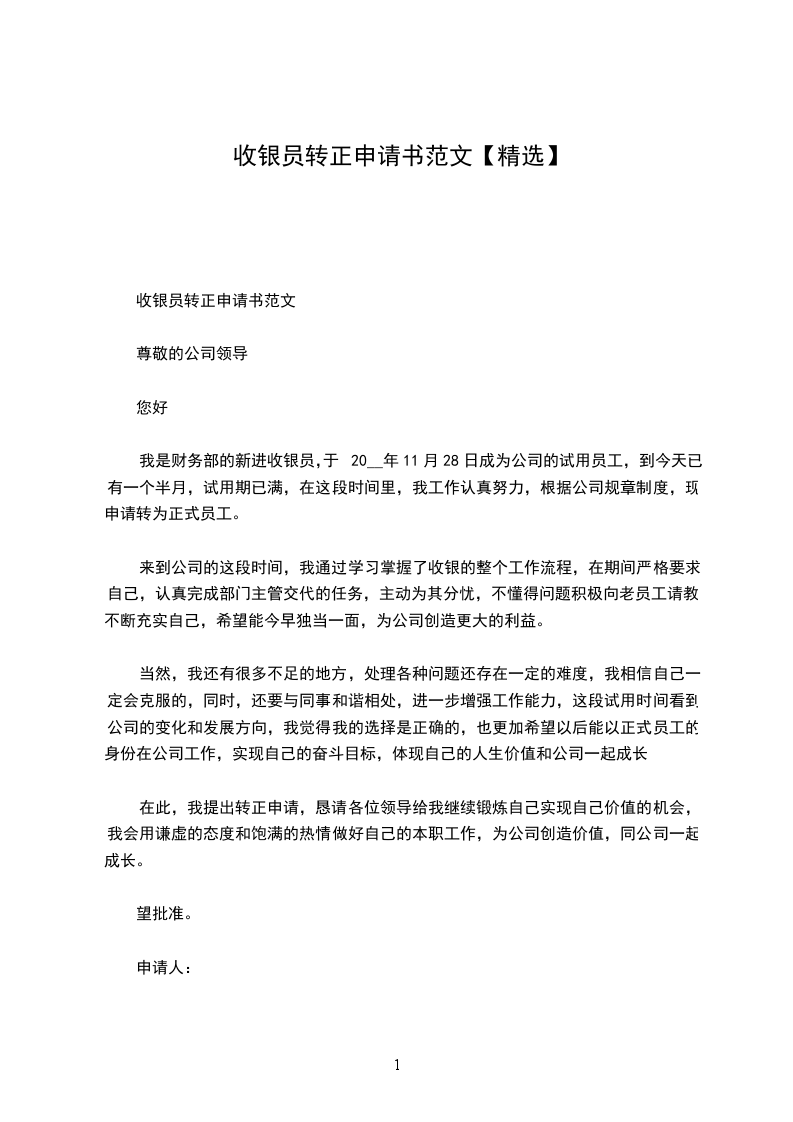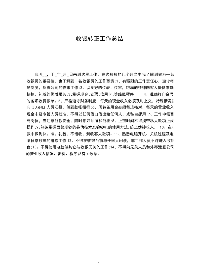 我已经能够熟练的掌握收银员应具备的业务技能!能够熟记和遵守店内的规章制度以及收银制度!能够熟练的操作收款机,能够在顾客结账的同时主动地为顾客推荐店内的新品及促销产品,能够主动宣传店内的促销信息!我认为自己具备了一名收银员的要求,所以特此申请转正,望领导批准。