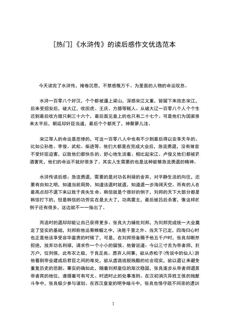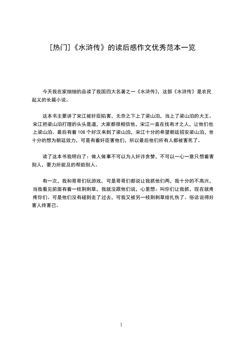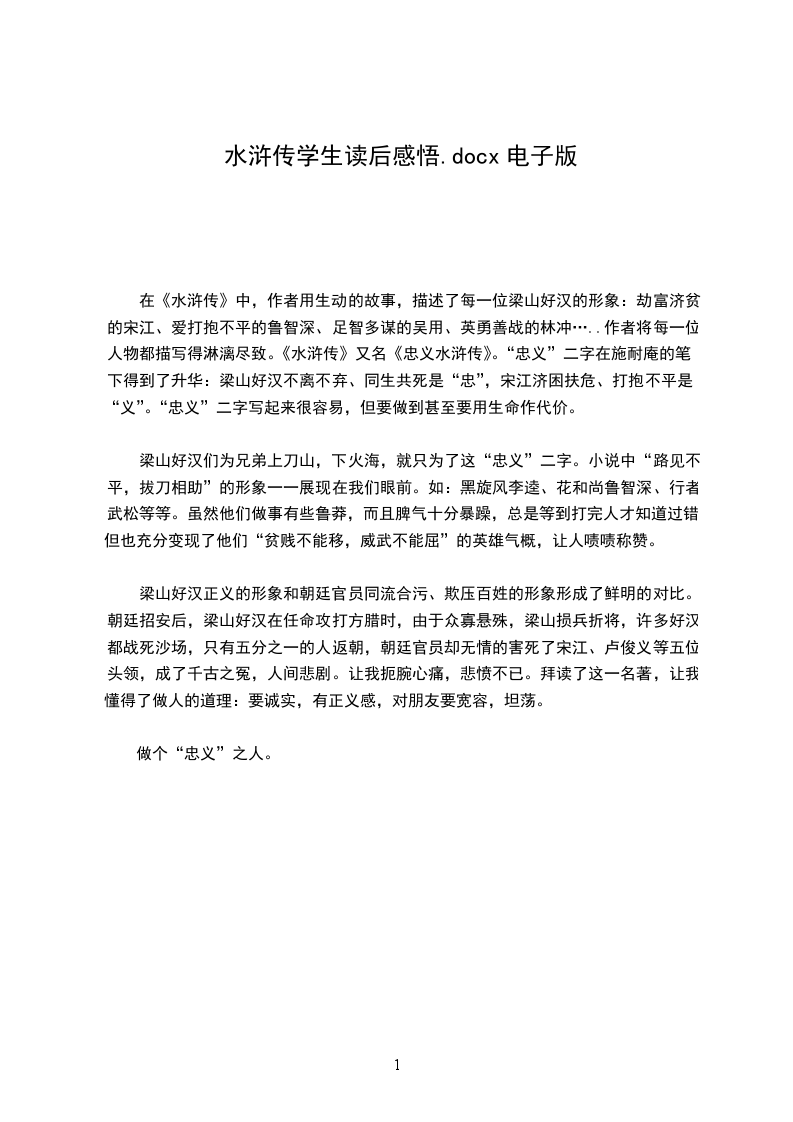 梁山好汉们为兄弟上刀山,下火海,就只为了这“忠义”二字。小说中“路见不平,拔刀相助”的形象一一展现在我们眼前。如:黑旋风李逵、花和尚鲁智深、行者武松等等。虽然他们做事有些鲁莽,而且脾气十分暴躁,总是等到打完人才知道过错,但也充分变现了他们“贫贱不能移,威武不能屈”的英雄气概,让人啧啧称赞。