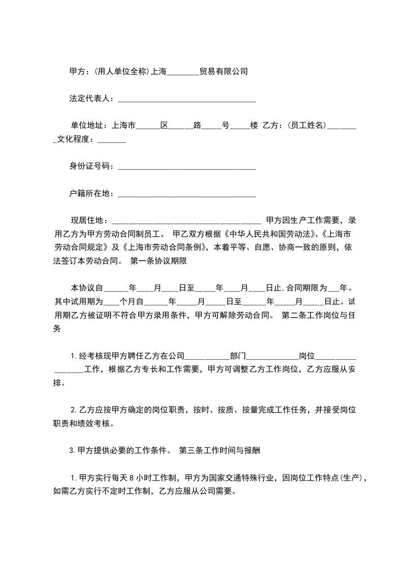 单位地址:上海市______区______路_____号_____楼 乙方:(员工姓名)________文化程度:_______