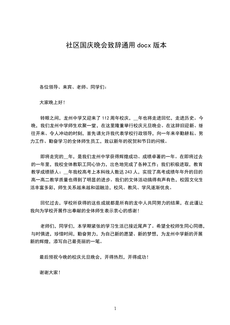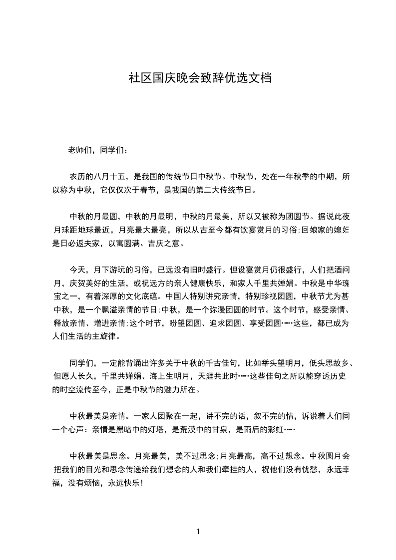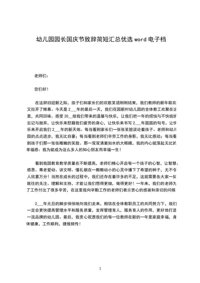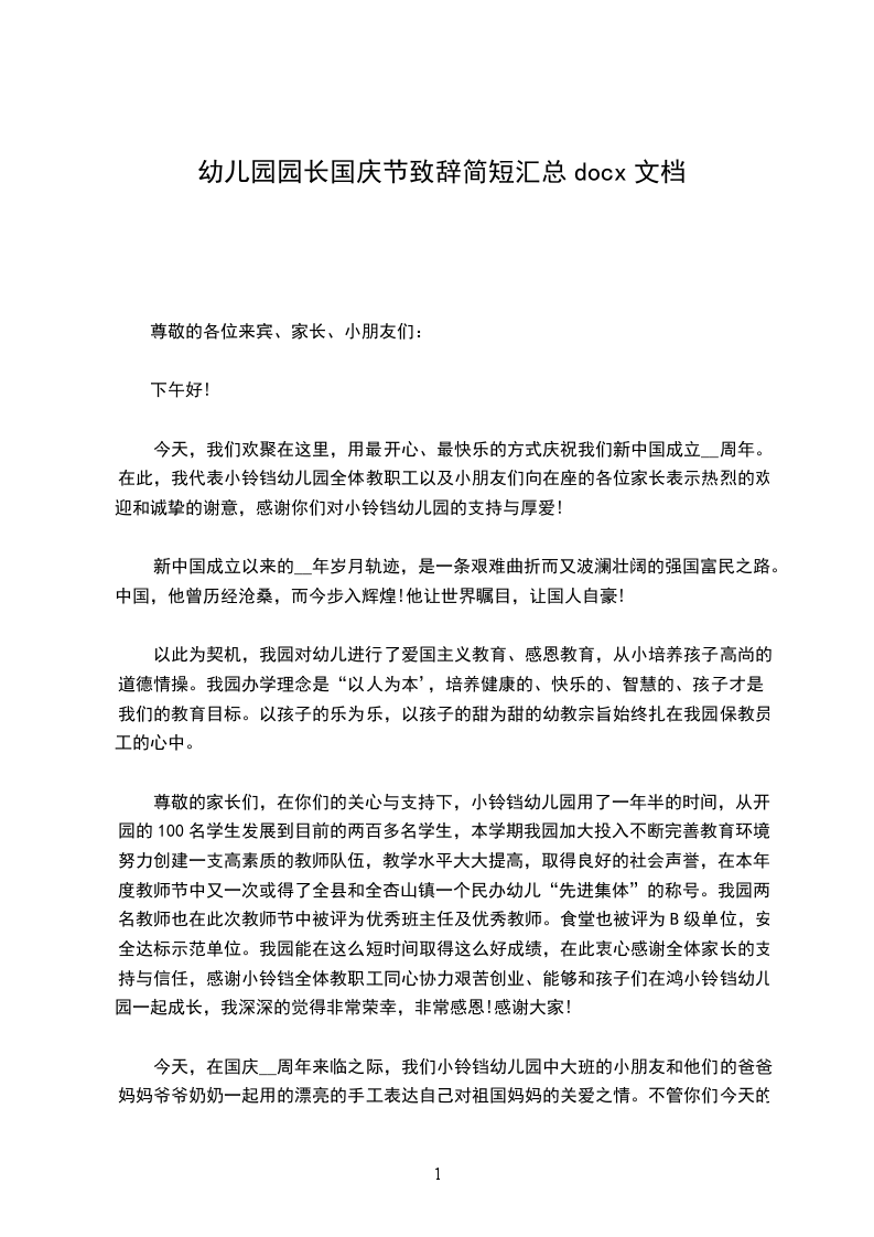 今天,我们欢聚在这里,用最开心、最快乐的方式庆祝我们新中国成立__周年。在此,我代表小铃铛幼儿园全体教职工以及小朋友们向在座的各位家长表示热烈的欢迎和诚挚的谢意,感谢你们对小铃铛幼儿园的支持与厚爱!