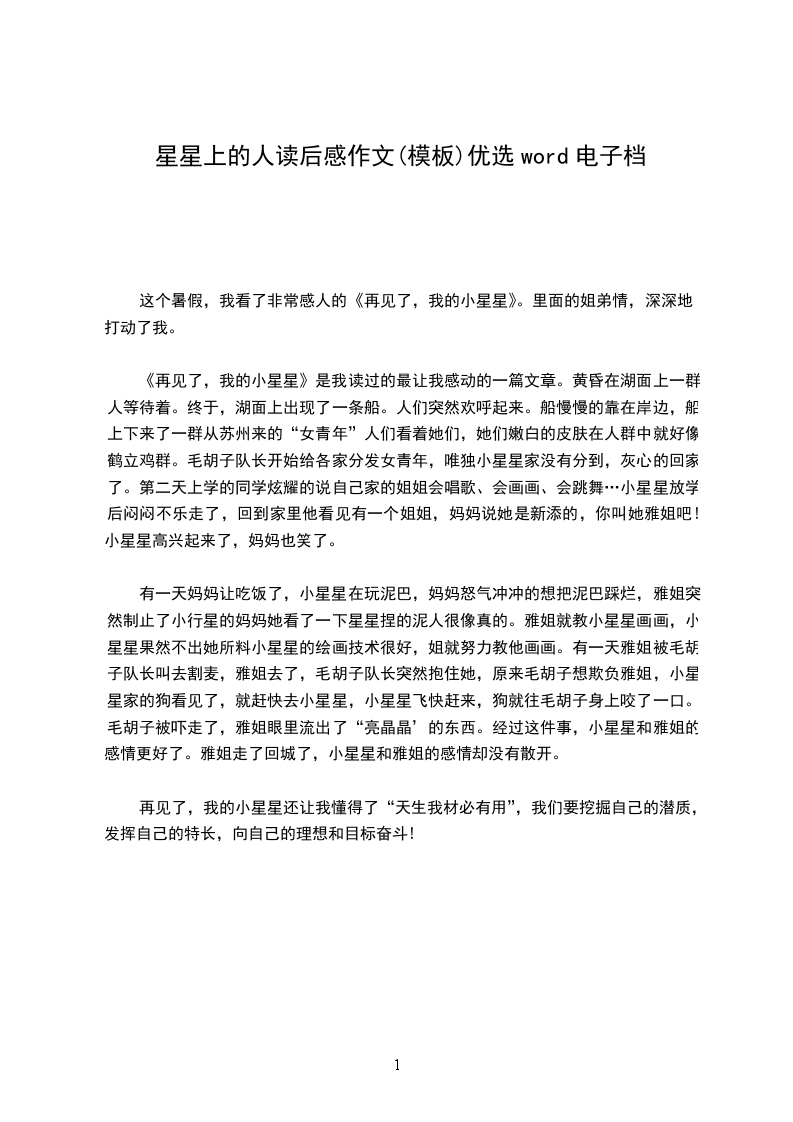 《再见了,我的小星星》是我读过的最让我感动的一篇文章。黄昏在湖面上一群人等待着。终于,湖面上出现了一条船。人们突然欢呼起来。船慢慢的靠在岸边,船上下来了一群从苏州来的“女青年”人们看着她们,她们嫩白的皮肤在人群中就好像鹤立鸡群。毛胡子队长开始给各家分发女青年,唯独小星星家没有分到,灰心的回家了。第二天上学的同学炫耀的说自己家的姐姐会唱歌、会画画、会跳舞…小星星放学后闷闷不乐走了,回到家里他看见有一个姐姐,妈妈说她是新添的,你叫她雅姐吧!小星星高兴起来了,妈妈也笑了。