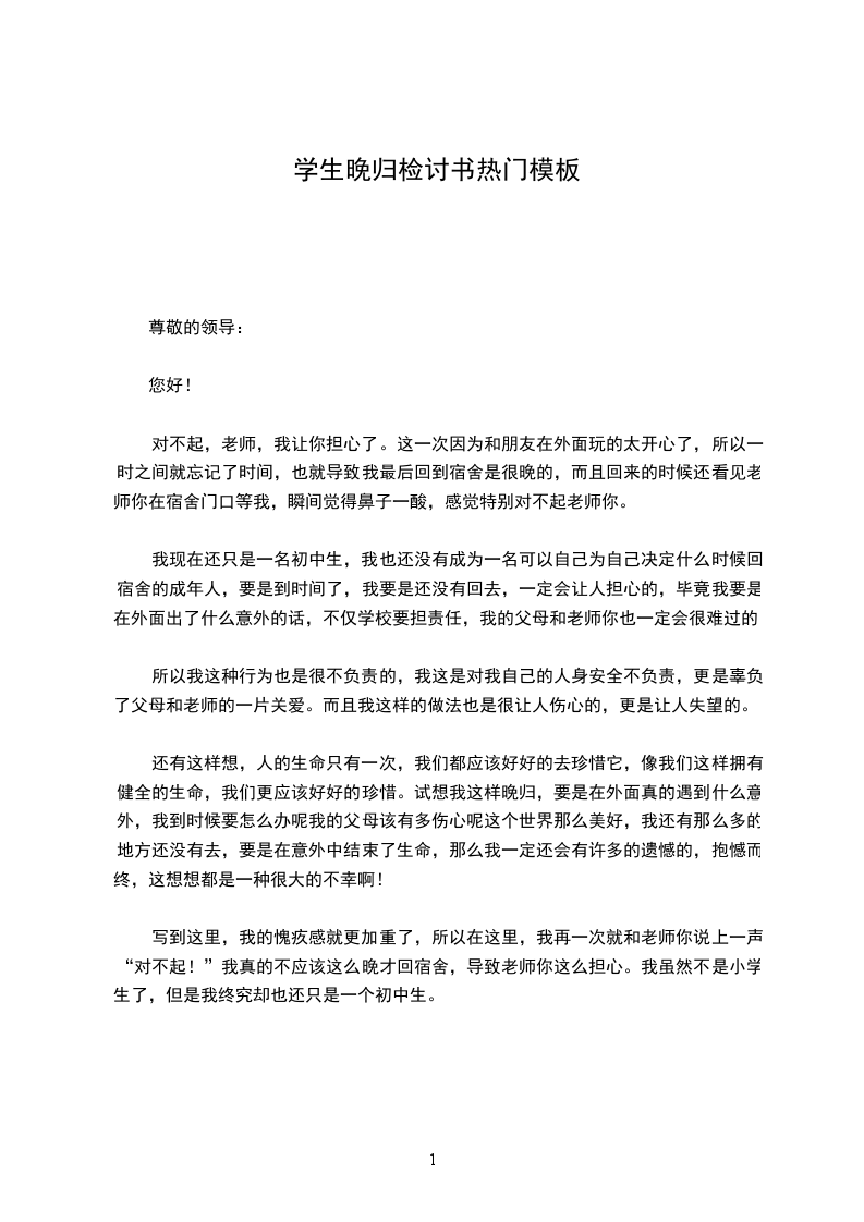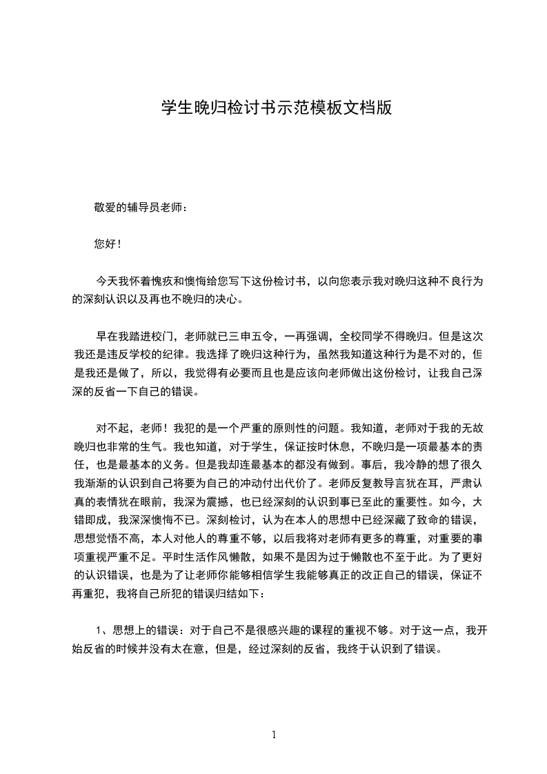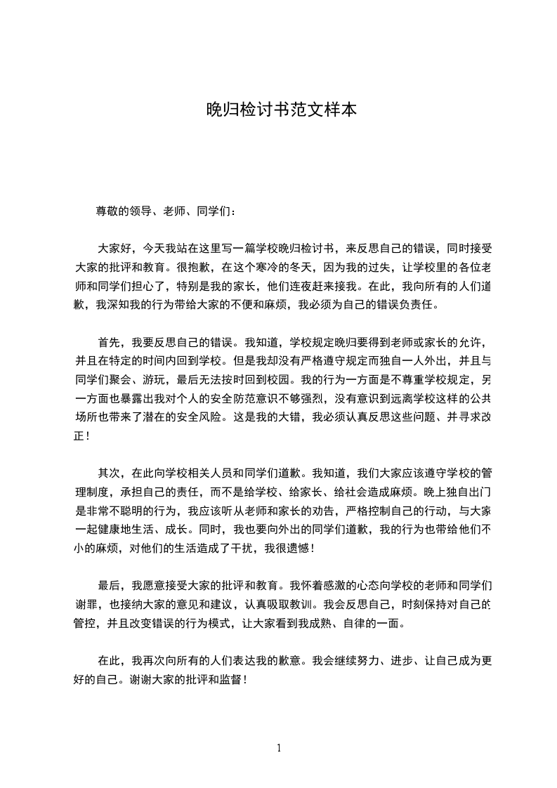 今天我怀着愧疚和懊悔给您写下这份检讨书,以向您表示我对晚归这种不良行为的深刻认识以及再也不晚归的决心。