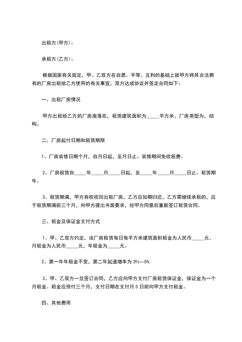 3、甲、乙双方一旦签订合同,乙方应向甲方支付厂房租赁保证金,保证金为一个月租金。租金应预付三个月,支付日期在支付月5日前向甲方支付租金。