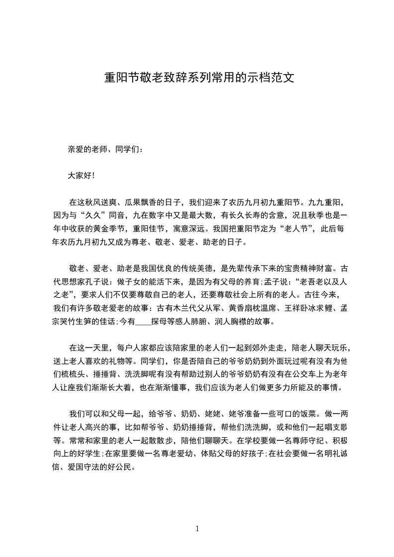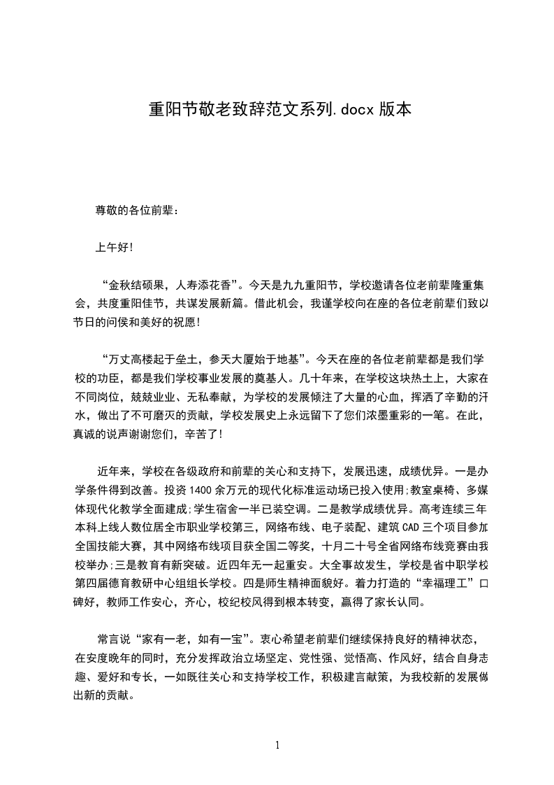 “金秋结硕果,人寿添花香”。今天是九九重阳节,学校邀请各位老前辈隆重集会,共度重阳佳节,共谋发展新篇。借此机会,我谨学校向在座的各位老前辈们致以节日的问侯和美好的祝愿!