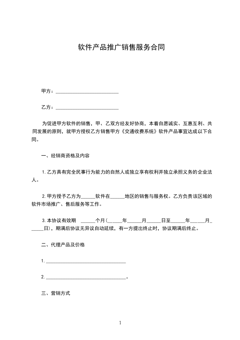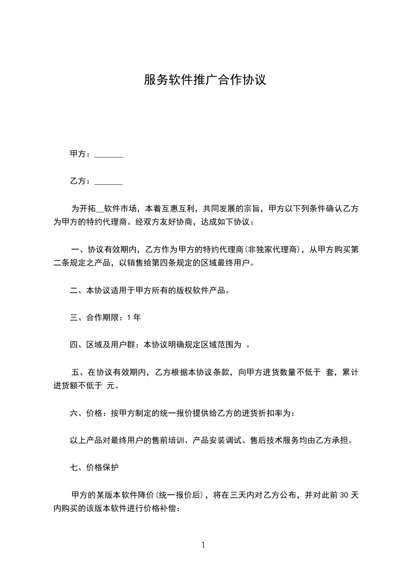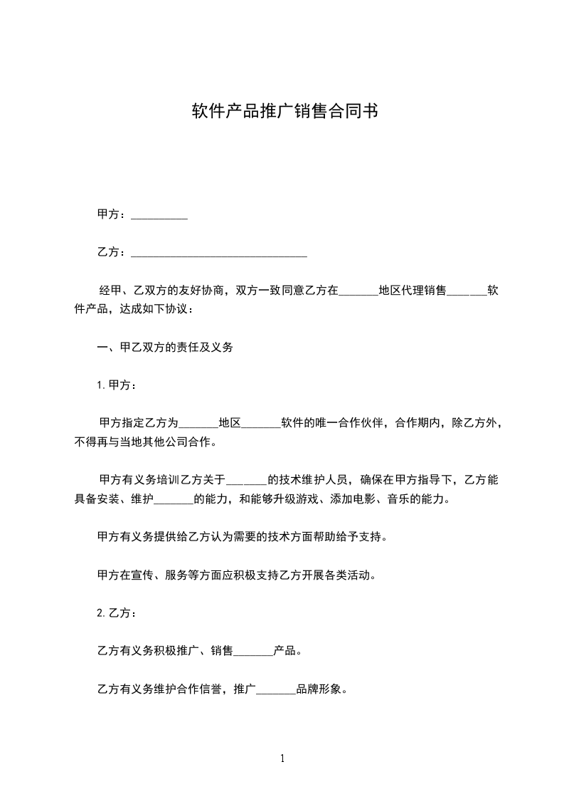 2.甲方授予乙方为______软件在______地区的销售与服务权。乙方负责该区域的软件市场推广、售后服务等工作。