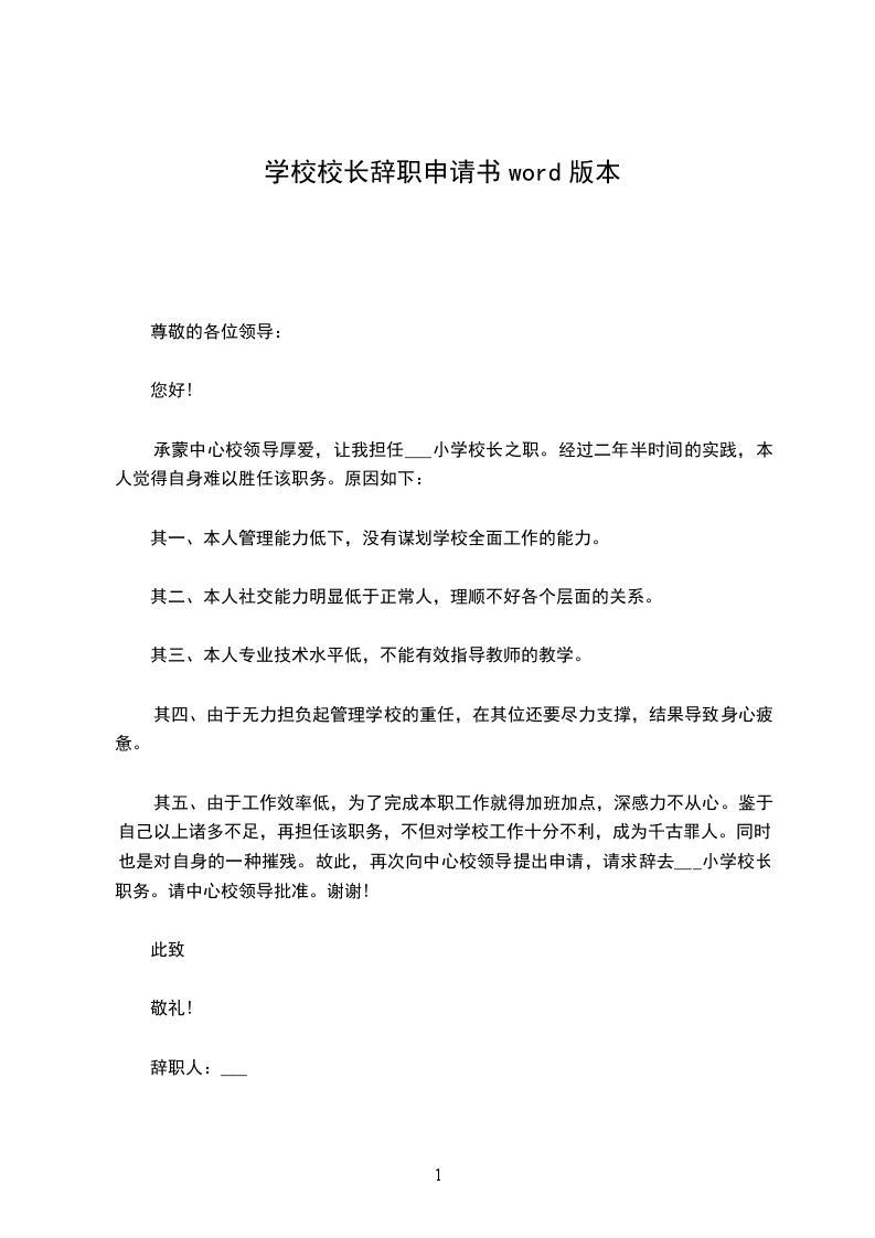 承蒙中心校领导厚爱,让我担任___小学校长之职。经过二年半时间的实践,本人觉得自身难以胜任该职务。原因如下: