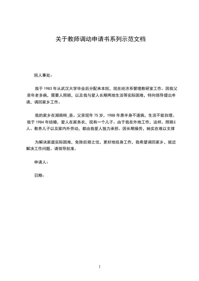 我于1983年从武汉大学毕业后分配来本院,现在经济系管理教研室工作。因我父亲年老多病,需要人照顾,以及我与爱人长期两地生活等实际困难,特向领导提出申请,调回家乡工作。