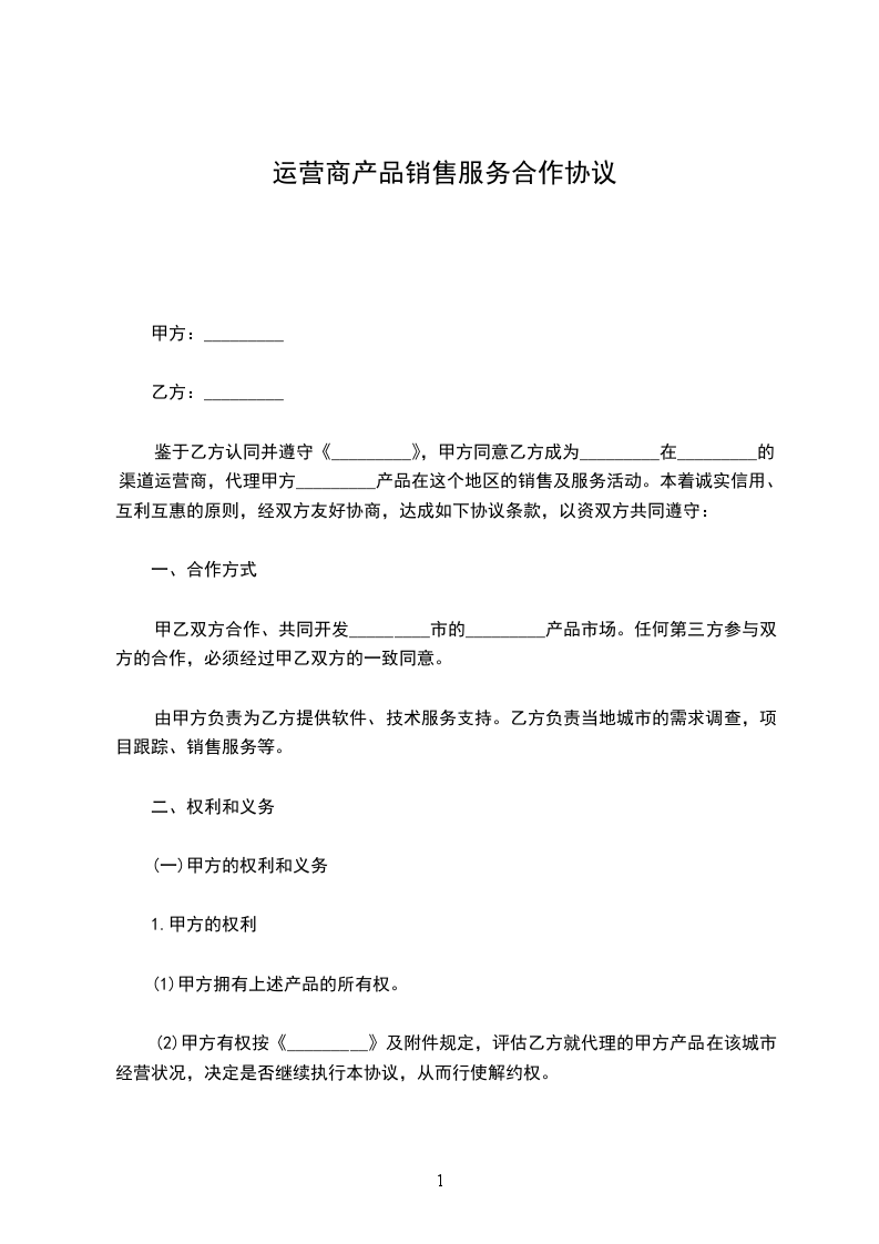 鉴于乙方认同并遵守《_________》,甲方同意乙方成为_________在_________的渠道运营商,代理甲方_________产品在这个地区的销售及服务活动。本着诚实信用、互利互惠的原则,经双方友好协商,达成如下协议条款,以资双方共同遵守: