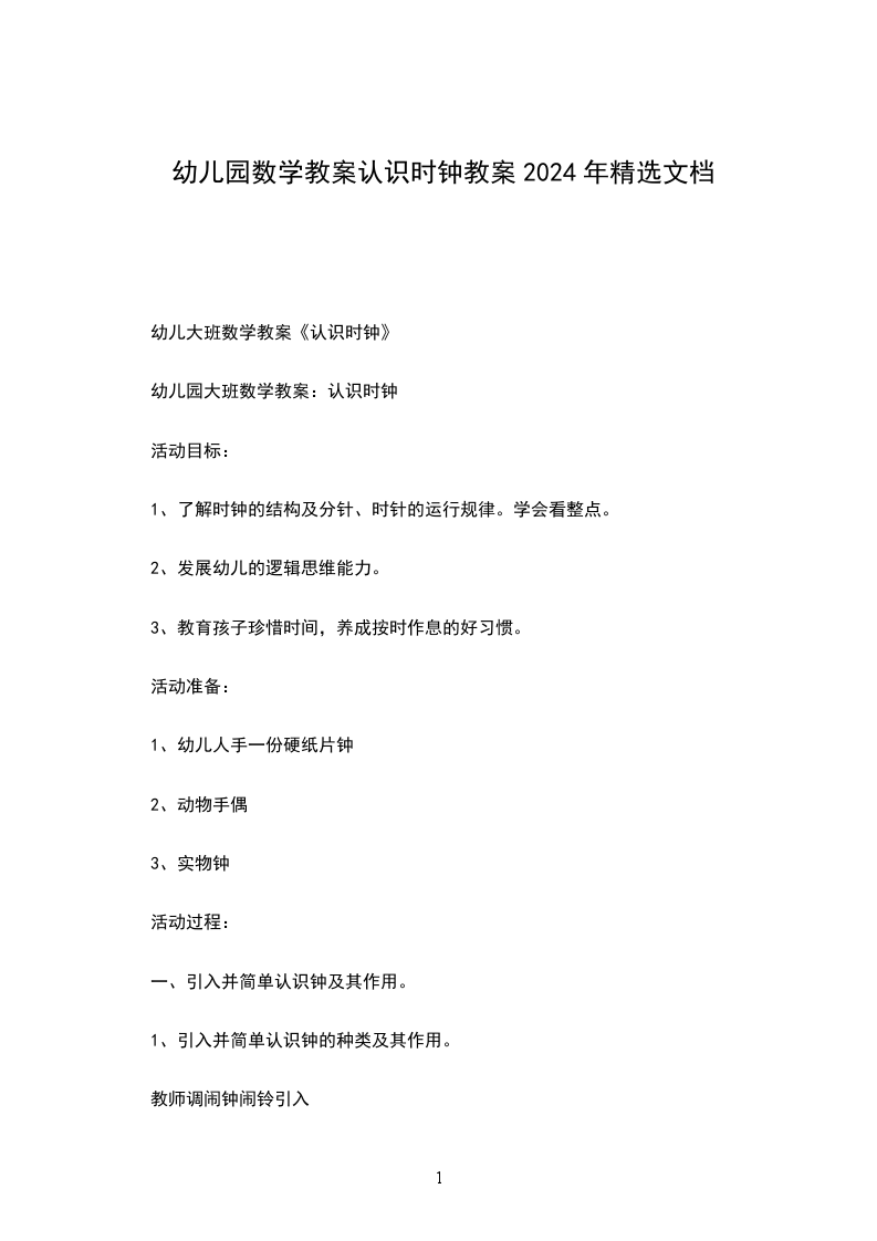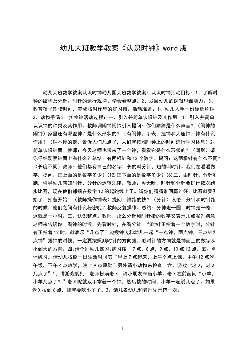 幼儿大班数学教案《认识时钟》