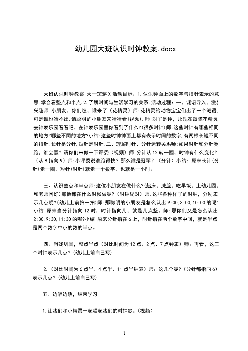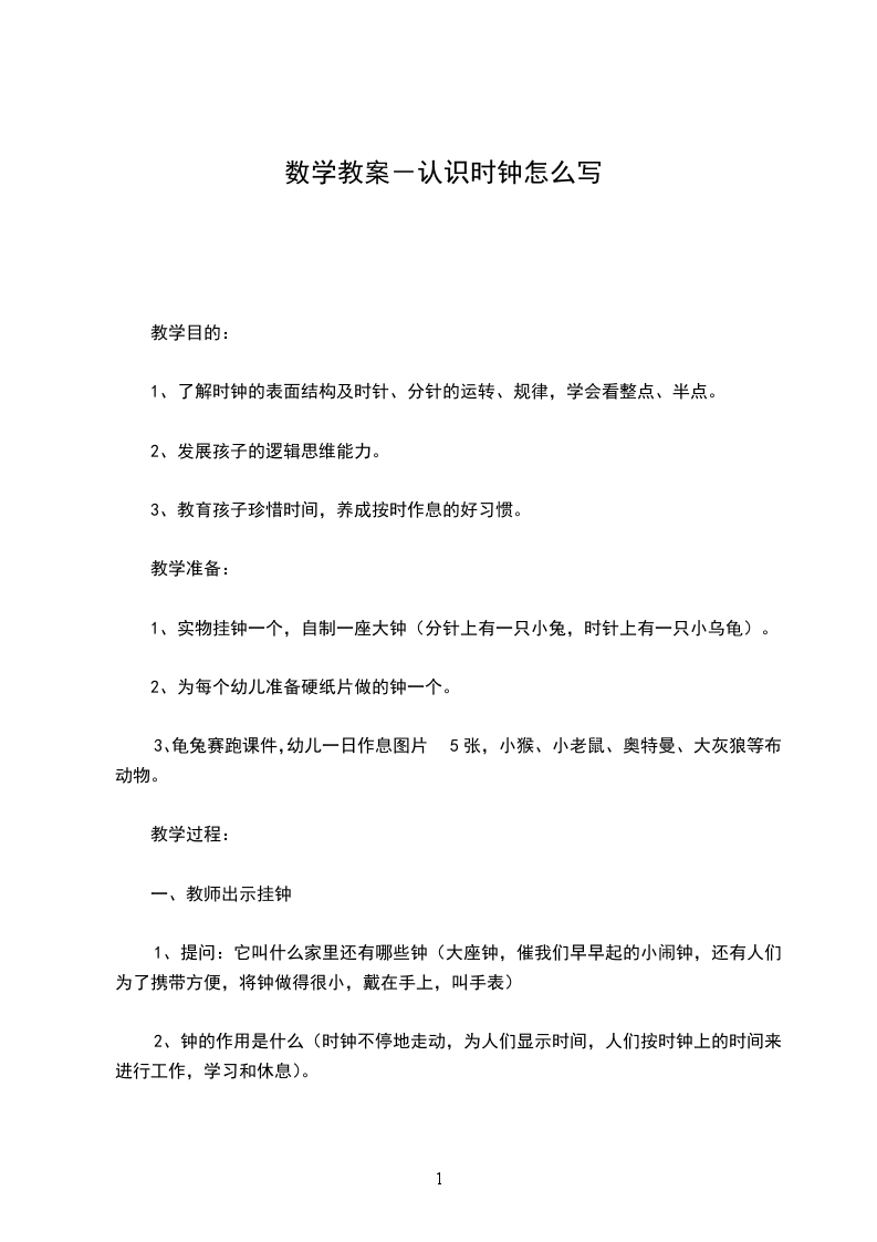 教师:那么分针和时针指的数字又表示几点呢别急,老师来告诉你。看钟的时候,先看时针,在看分针。当时针正指着一个数字时,分针有正指着12时,就表示“几点了”边拨钟边和幼儿一起“一点钟,两点钟,三点钟……六点钟”