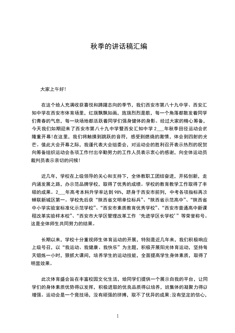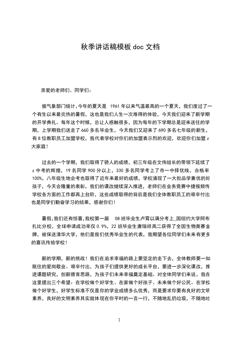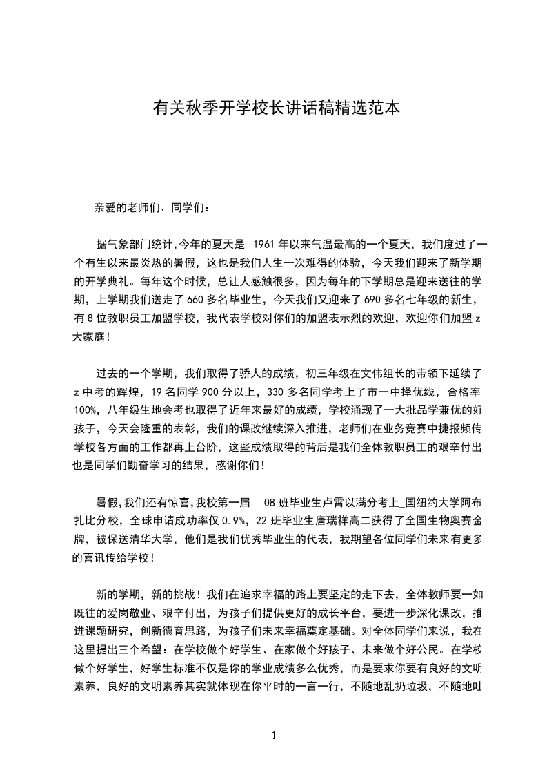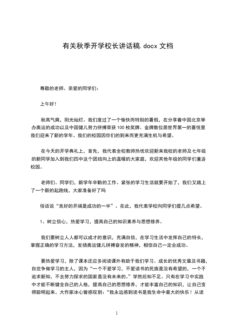 秋高气爽,阳光灿烂。我们度过了一个愉快而特别的暑假,在分享着中国北京举办奥运的成功以及中国健儿努力拼搏荣获100枚奖牌、金牌数位居世界第一的喜悦里,我们迎来了新的学年。我们的校园因你们的到来而更充满生机与希望。