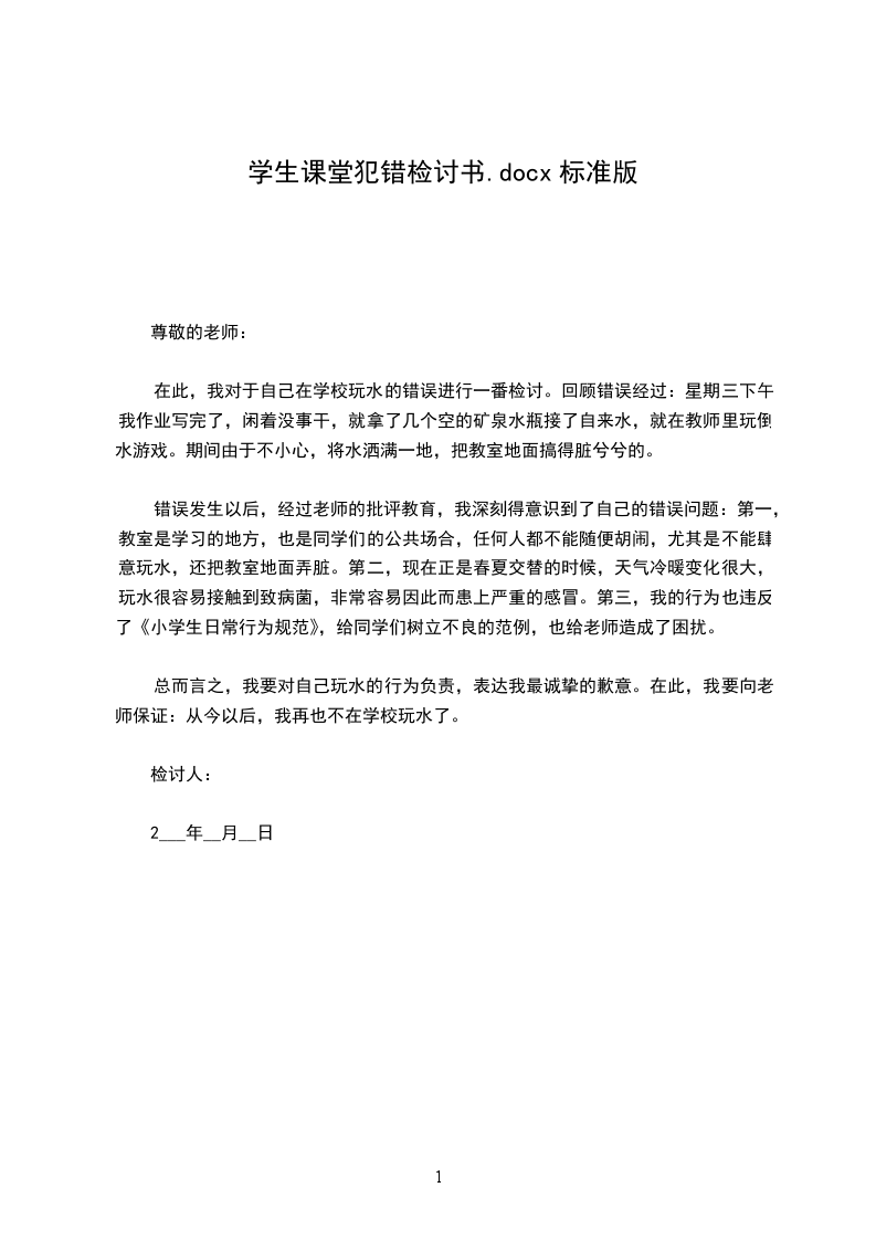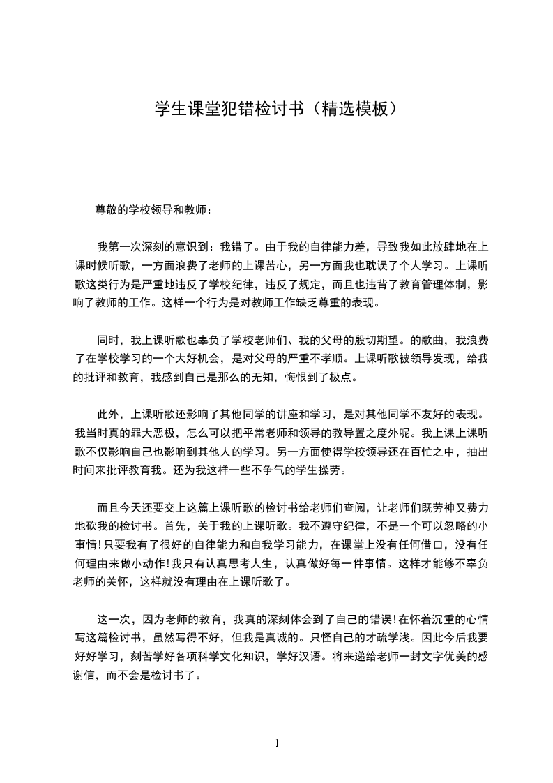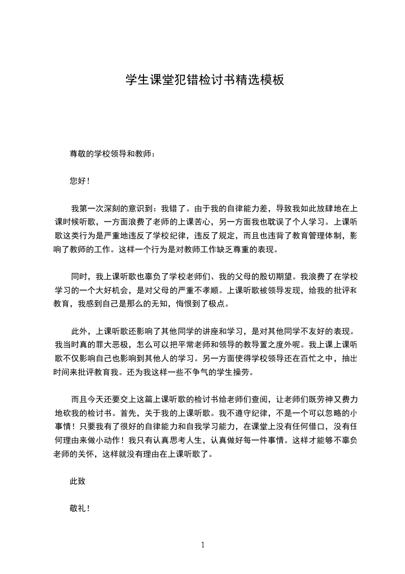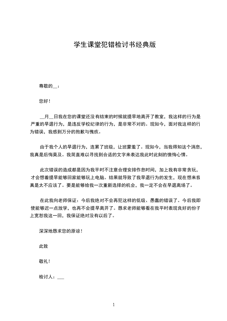 __月__日我在您的课堂还没有结束的时候就提早地离开了教室,我这样的行为是严重的早退行为,是违反学校纪律的行为,是非常不对的。现如今,面对我这样的行为错误,我感到万分的抱歉与愧疚。