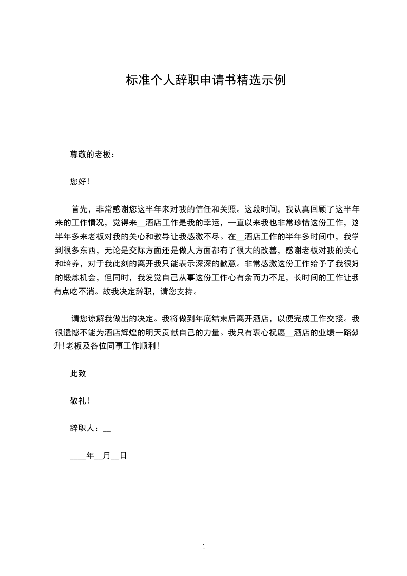 请您谅解我做出的决定。我将做到年底结束后离开酒店,以便完成工作交接。我很遗憾不能为酒店辉煌的明天贡献自己的力量。我只有衷心祝愿__酒店的业绩一路飙升!老板及各位同事工作顺利!