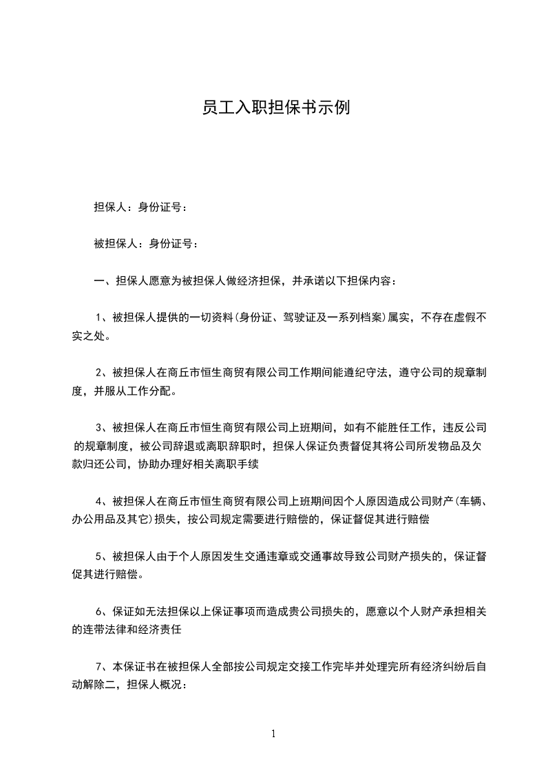 2、被担保人在商丘市恒生商贸有限公司工作期间能遵纪守法,遵守公司的规章制度,并服从工作分配。