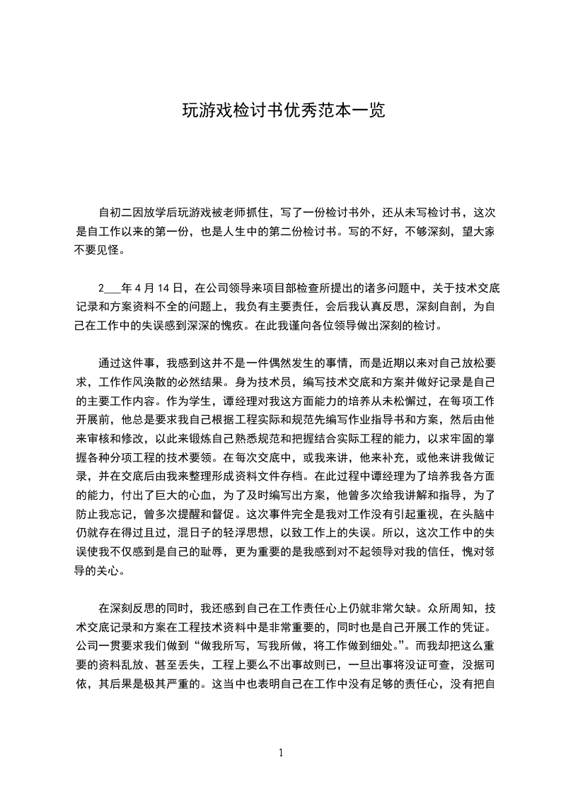 2___年4月14日,在公司领导来项目部检查所提出的诸多问题中,关于技术交底记录和方案资料不全的问题上,我负有主要责任,会后我认真反思,深刻自剖,为自己在工作中的失误感到深深的愧疚。在此我谨向各位领导做出深刻的检讨。