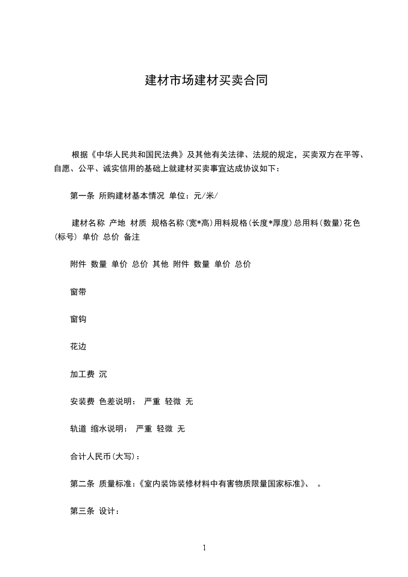 根据《中华人民共和国民法典》及其他有关法律、法规的规定,买卖双方在平等、自愿、公平、诚实信用的基础上就建材买卖事宜达成协议如下:
