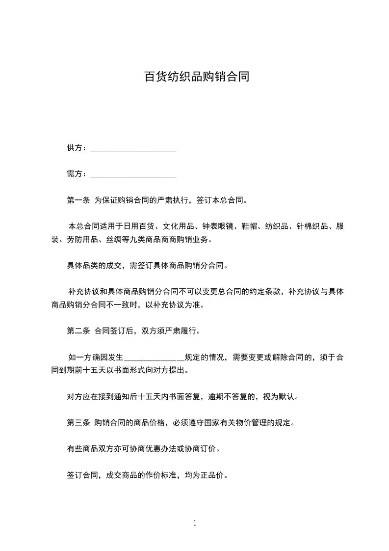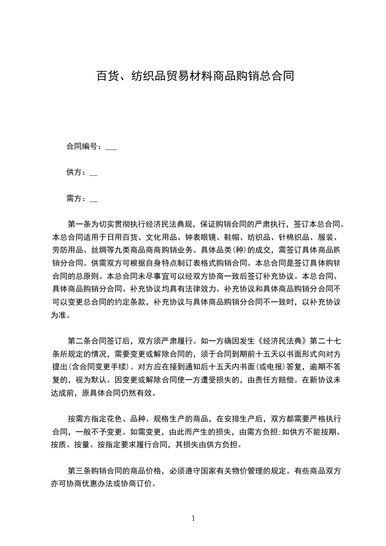第一条为切实贯彻执行经济民法典规,保证购销合同的严肃执行,签订本总合同。本总合同适用于日用百货、文化用品、钟表眼镜、鞋帽、纺织品、针棉织品、服装、劳防用品、丝绸等九类商品商商购销业务。具体品类(种)的成交,需签订具体商品购销分合同。供需双方可根据自身特点制订表格式购销合同。本总合同是签订具体购销合同的总原则。本总合同未尽事宜可以经双方协商一致后签订补充协议。本总合同、具体商品购销分合同、补充协议均具有法律效力。补充协议和具体商品购销分合同不可以变更总合同的约定条款,补充协议与具体商品购销分合同不一致时,以补充协议为准。
