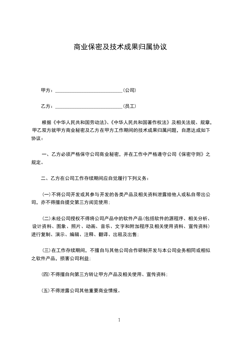根据《中华人民共和国劳动法》、《中华人民共和国着作权法》及相关法规、规章,甲乙双方就甲方商业秘密及乙方在甲方工作期间的技术成果归属问题,自愿达成如下协议: