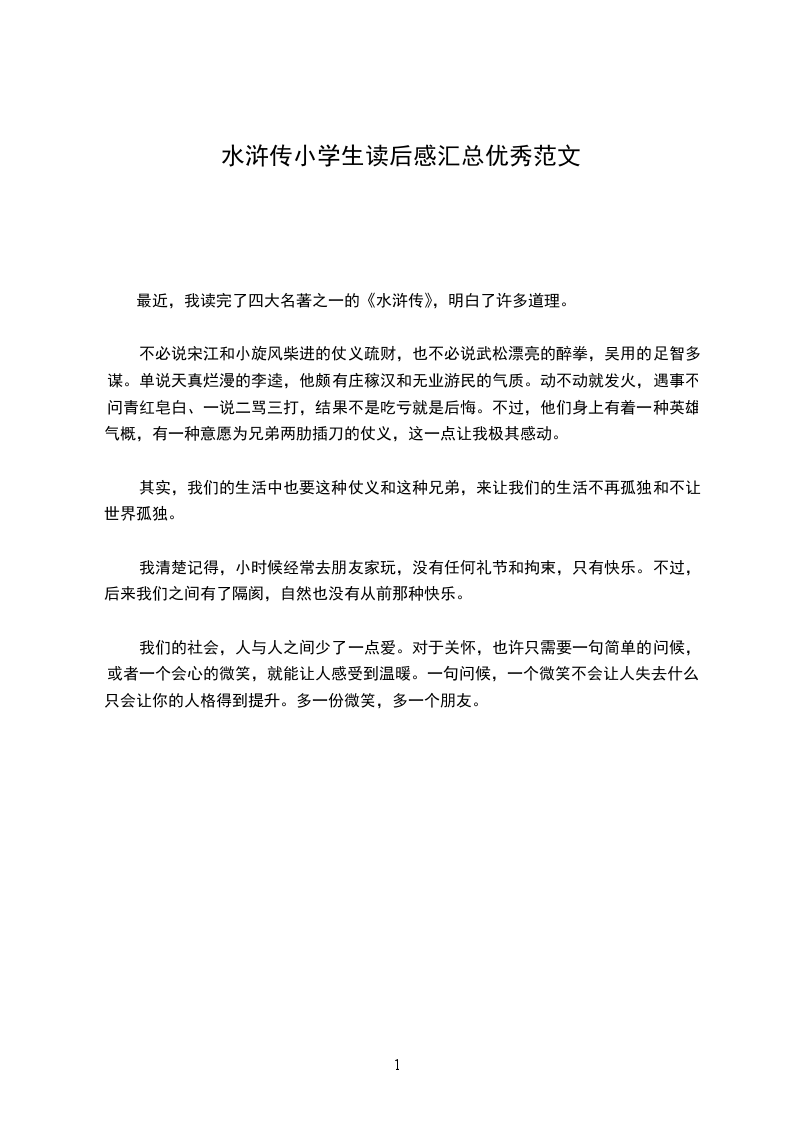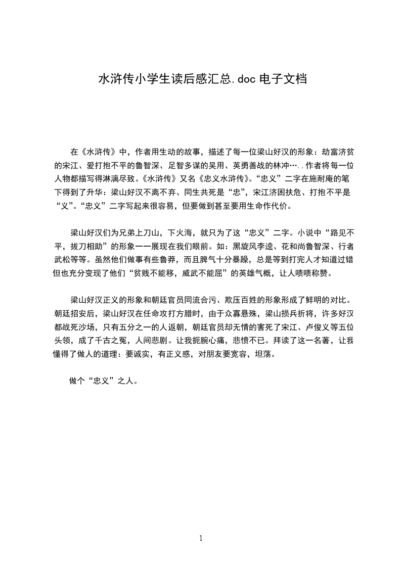梁山好汉们为兄弟上刀山,下火海,就只为了这“忠义”二字。小说中“路见不平,拔刀相助”的形象一一展现在我们眼前。如:黑旋风李逵、花和尚鲁智深、行者武松等等。虽然他们做事有些鲁莽,而且脾气十分暴躁,总是等到打完人才知道过错,但也充分变现了他们“贫贱不能移,威武不能屈”的英雄气概,让人啧啧称赞。
