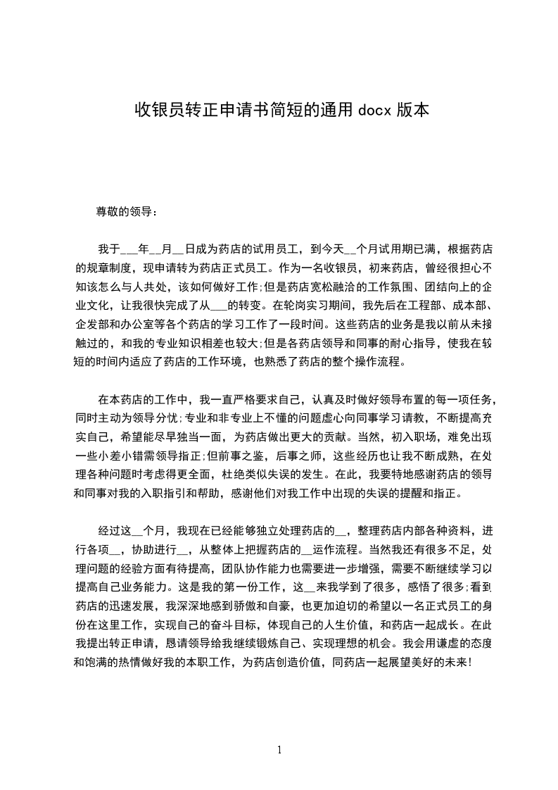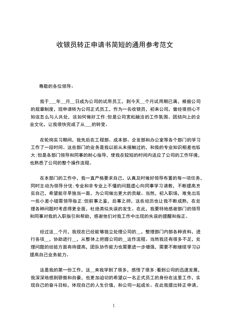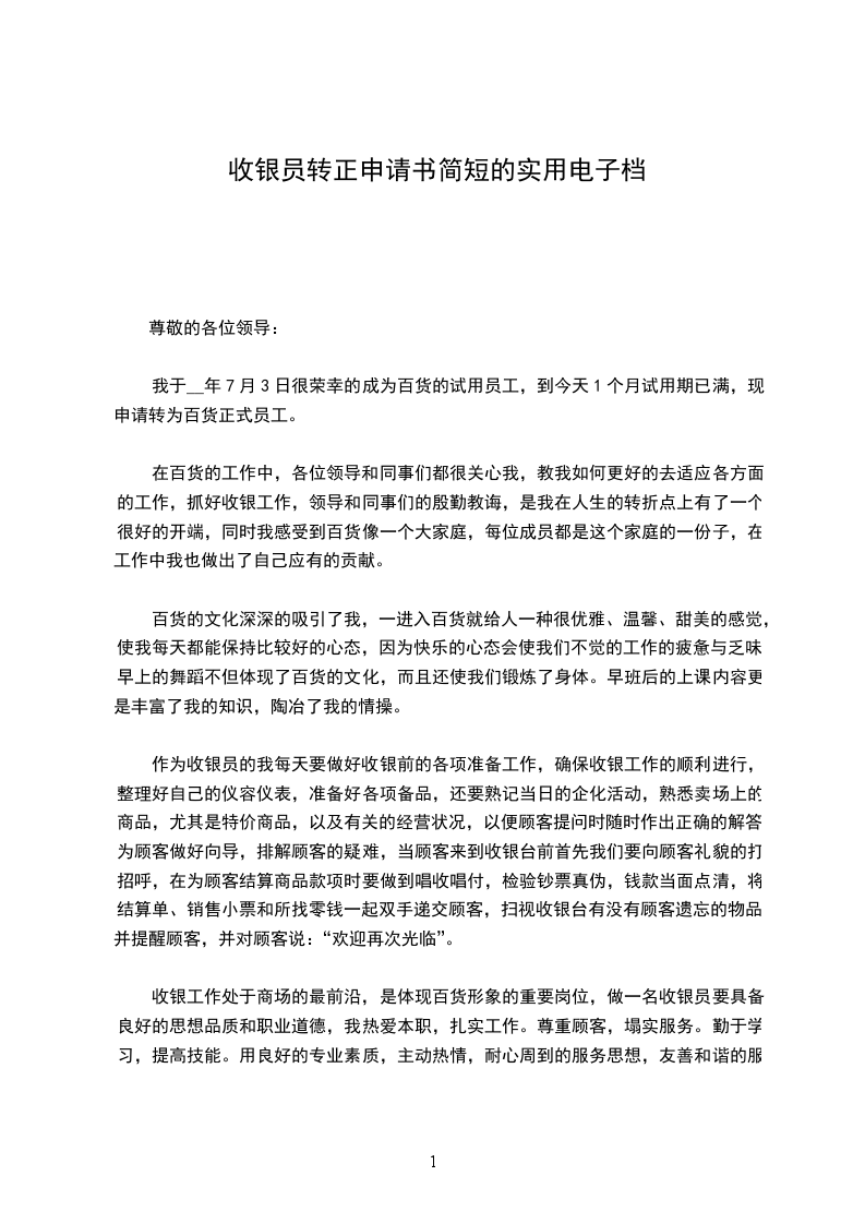 我于___年__月__日成为公司的试用员工,到今天__个月试用期已满,根据公司的规章制度,现申请转为公司正式员工,作为一名收银员,初来公司,曾经很担心不知该怎么与人共处,该如何做好工作;但是公司宽松融洽的工作氛围、团结向上的企业文化,让我很快完成了从___的转变。