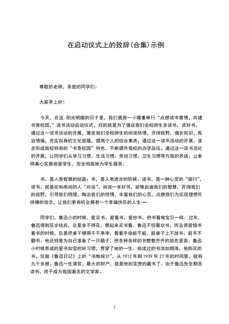 今天,在这.阳光明媚的日子里,我们鹿原一小隆重举行“点燃读书激情,共建书香校园,”读书活动启动仪式,目的就是为了倡议我们全校师生多读书,读好书。通过这一读书活动的开展,激发我们全校师生的阅读热情,开阔视野,增长知识,陶冶情操,充实自身的文化底蕴,提高个人的综合素质;通过这一读书活动的开展,逐步形成我校特有的“书香校园”特色,不断提升我校的办学品位;通过这一读书活动的开展,让同学们从学习习惯、生活习惯、劳动习惯、卫生习惯等方面的养成;让教师真心实意地爱学生,完全彻底地为学生服务。