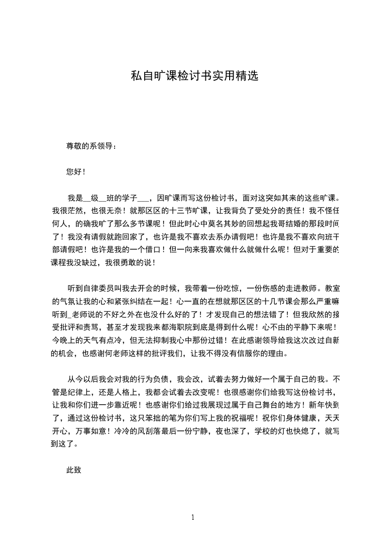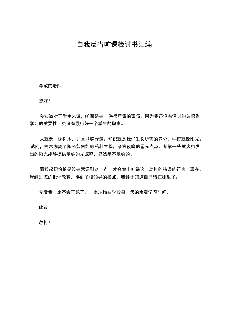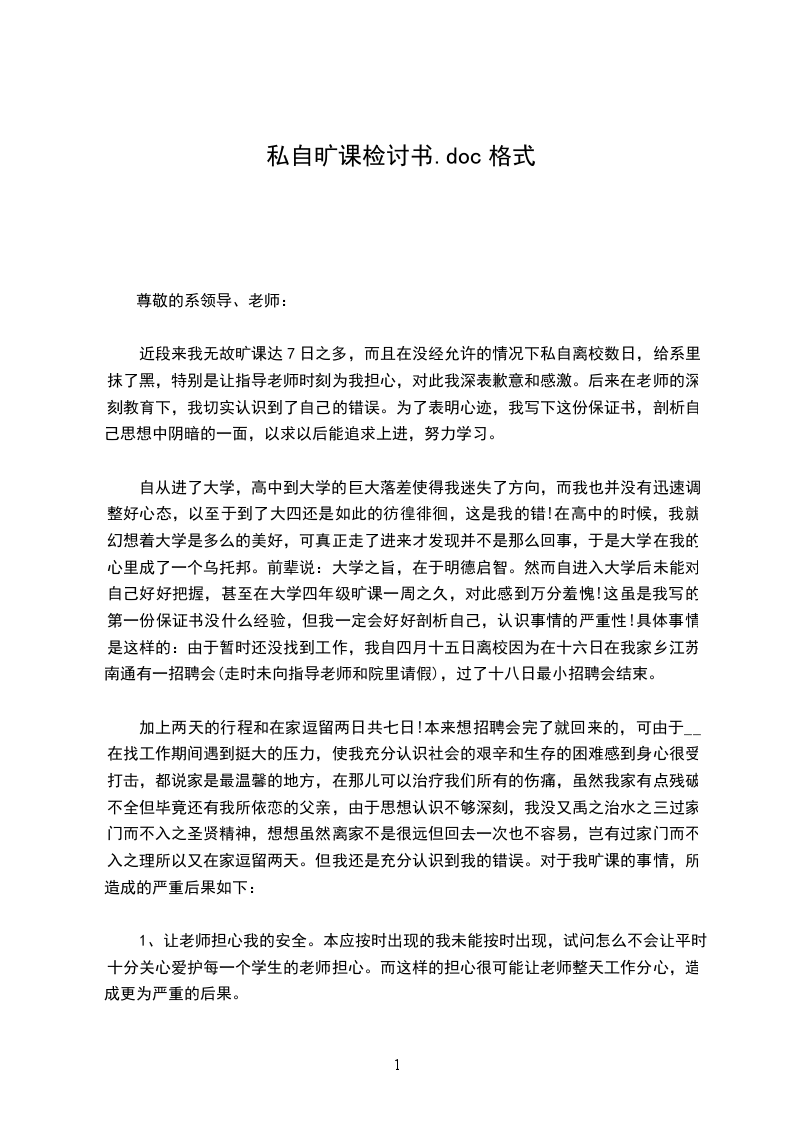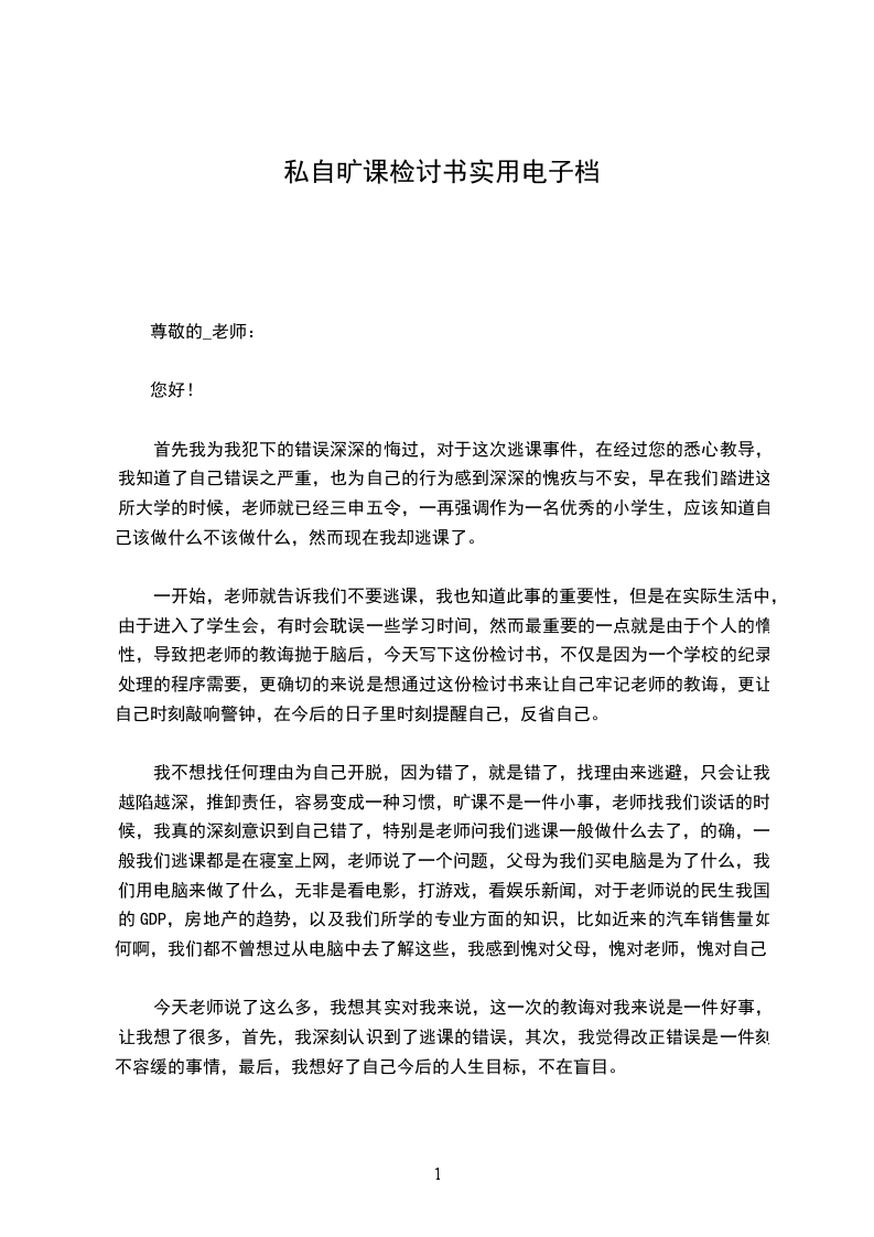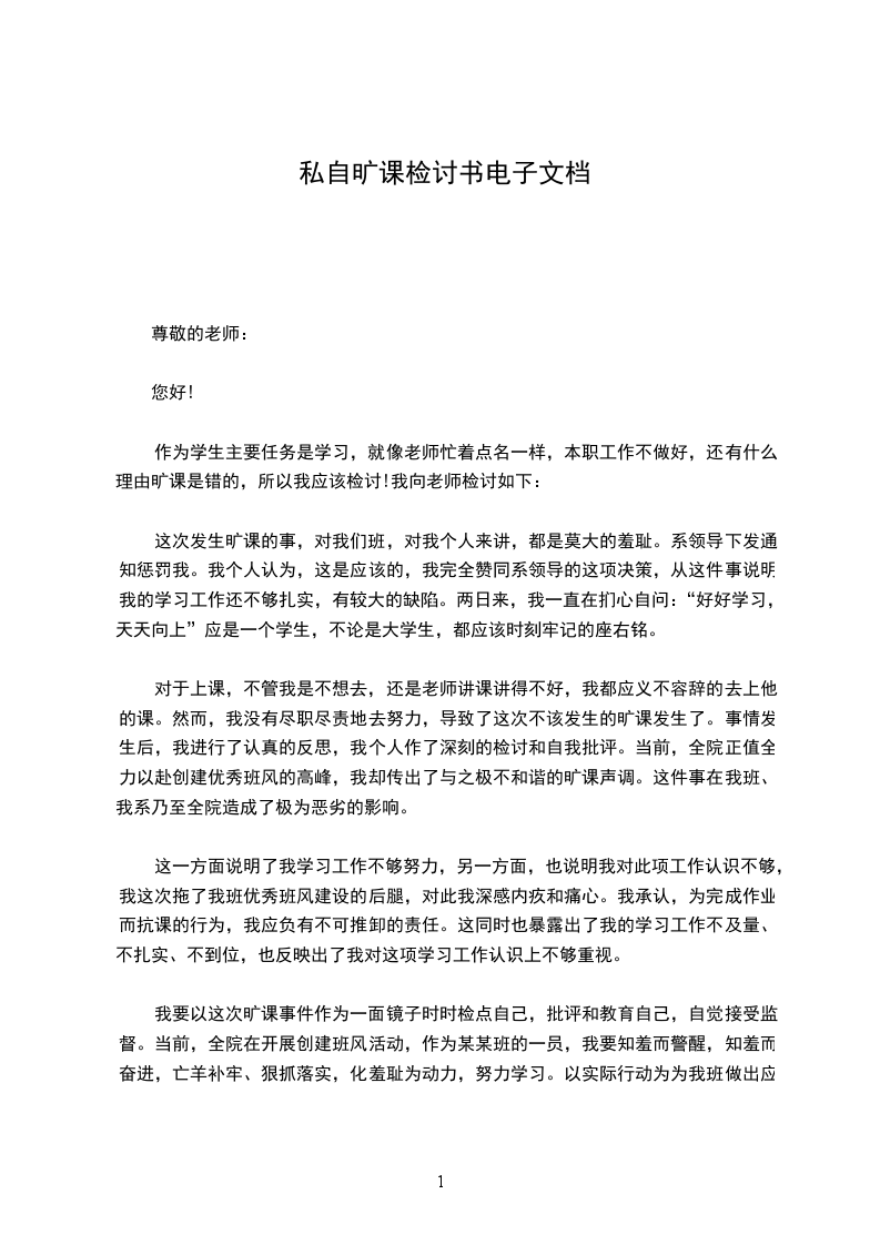 一开始,老师就告诉我们不要逃课,我也知道此事的重要性,但是在实际生活中,由于进入了学生会,有时会耽误一些学习时间,然而最重要的一点就是由于个人的惰性,导致把老师的教诲抛于脑后,今天写下这份检讨书,不仅是因为一个学校的纪录处理的程序需要,更确切的来说是想通过这份检讨书来让自己牢记老师的教诲,更让自己时刻敲响警钟,在今后的日子里时刻提醒自己,反省自己。