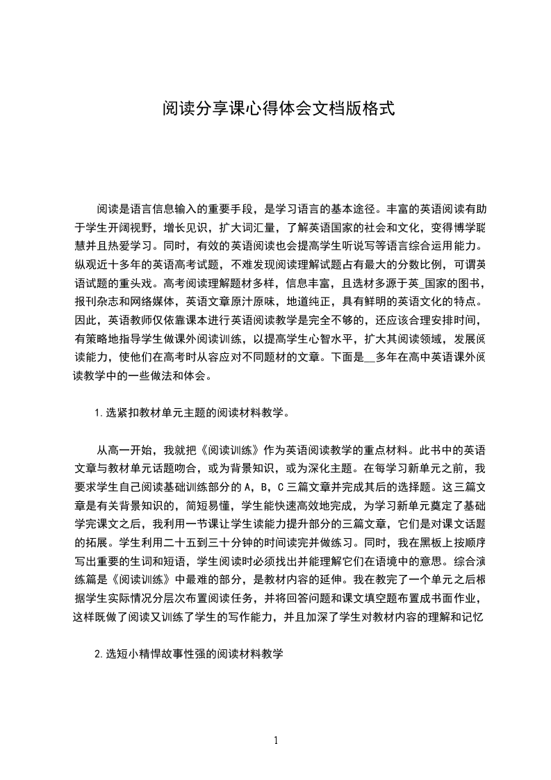 阅读是语言信息输入的重要手段,是学习语言的基本途径。丰富的英语阅读有助于学生开阔视野,增长见识,扩大词汇量,了解英语国家的社会和文化,变得博学聪慧并且热爱学习。同时,有效的英语阅读也会提高学生听说写等语言综合运用能力。纵观近十多年的英语高考试题,不难发现阅读理解试题占有最大的分数比例,可谓英语试题的重头戏。高考阅读理解题材多样,信息丰富,且选材多源于英_国家的图书,报刊杂志和网络媒体,英语文章原汁原味,地道纯正,具有鲜明的英语文化的特点。因此,英语教师仅依靠课本进行英语阅读教学是完全不够的,还应该合理安排时间,有策略地指导学生做课外阅读训练,以提高学生心智水平,扩大其阅读领域,发展阅读能力,使他们在高考时从容应对不同题材的文章。下面是__多年在高中英语课外阅读教学中的一些做法和体会。