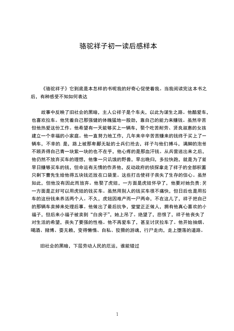故事中反映了旧社会的黑暗,主人公祥子是个车夫,以此为谋生之路。他酷爱车,也喜欢拉车。他凭着自己那强健的体魄猛地一股劲,靠自己的能力来赚钱。虽然辛苦,但他热爱这份工作。他希望有一天能够买上一辆车,娶个吃苦耐劳、贤良淑惠的女孩,建立一个幸福的小家庭。他一直努力地工作,几年来辛辛苦苦赚来的钱终于买上了一辆车,不幸的.是,路上被那卑鄙无耻的士兵们抢去,祥子与他们搏斗,满脚的泡他不顾弄得自己青一块紫一块的也不在乎,他心疼的是那血汗钱。从兵营逃出来之后,他仍然不放弃买车的理想,他像一只讥饿的野兽,早出晚归,多拉快跑,就是为了能早日赚够买车的钱,但命运有无情的作弄他,反动政府的侦探拿走了祥子的全部积蓄,只剩下曹先生给他得五块钱还放在口袋里。这些打击使祥子丧失了生存的信心。虽然如此,但他没有因此而放弃。他娶了虎妞,一方面是虎妞怀孕了,他要对她负责;另一方面是正好可以用虎妞的钱买车。虽然用别人的钱买车很不痛快,但日后也是用拉车的这份钱来养活两个人。不久,虎妞因难产而一尸两命,不在这儿了,祥子把自己的那辆车卖掉来处理后事。他做出了最后抗争,堂堂正正做人,拥有他真心喜欢的小福子,但后来小福子被卖到“白房子”,她上吊了。绝望了,悲恨了,祥子他丧失了对生活的希望,丧失了要强的性格。他不再爱车了,甚至讨厌拉车了。他开始抽烟、喝酒、赌博、耍无赖,变得懒惰、自私、狡猾的游魂,行尸走肉,走上堕落的道路。