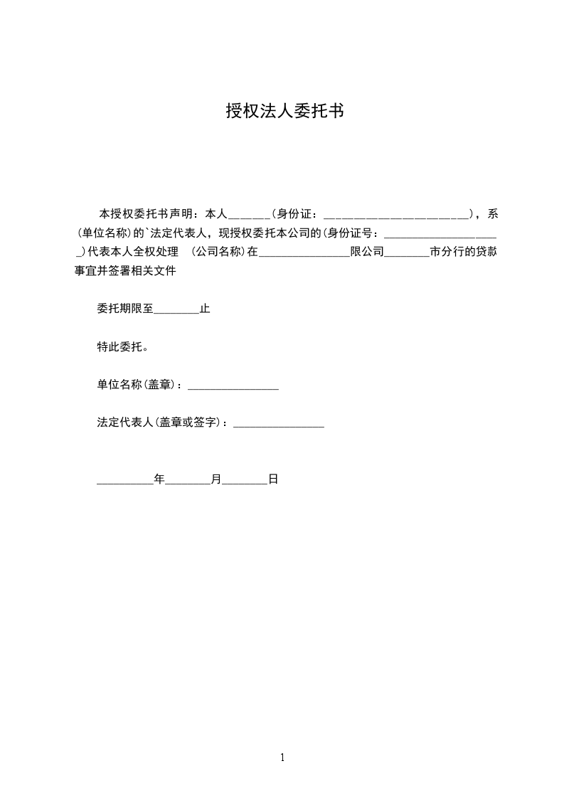 本授权委托书声明:本人_______(身份证:________________________),系 (单位名称)的`法定代表人,现授权委托本公司的(身份证号:_____________________)代表本人全权处理 (公司名称)在________________限公司________市分行的贷款事宜并签署相关文件