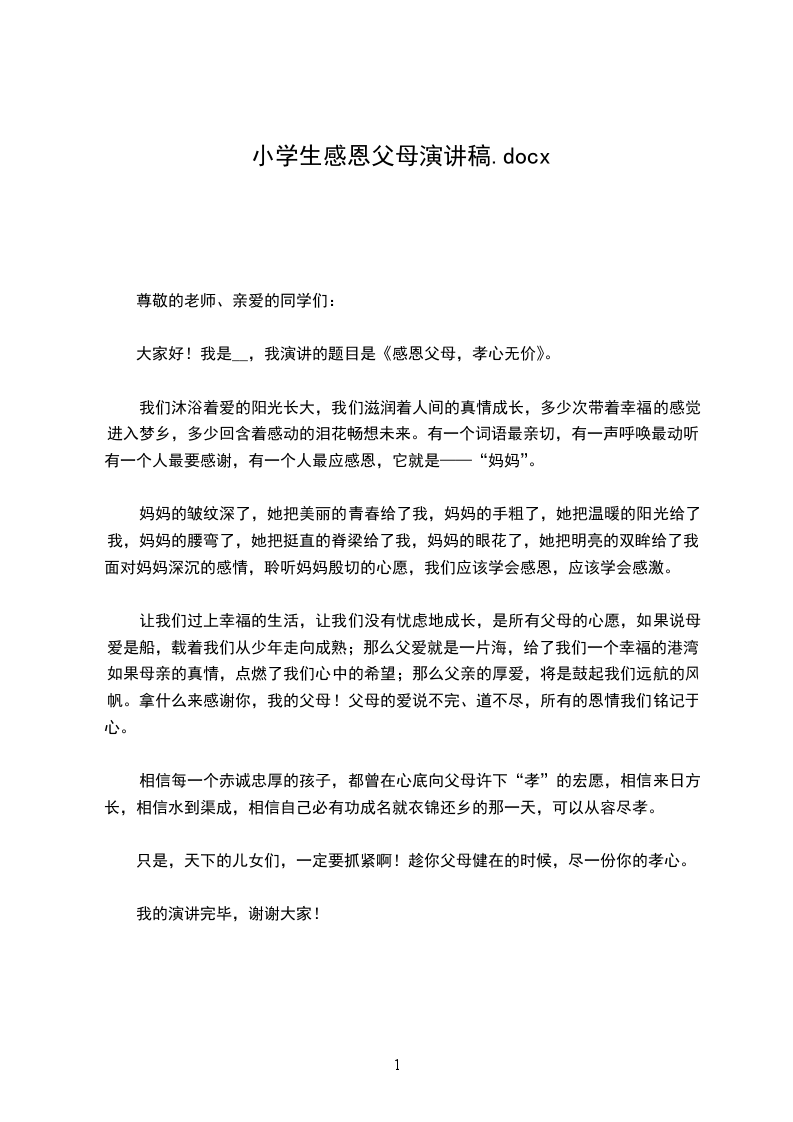 大家好!我是__,我演讲的题目是《感恩父母,孝心无价》。