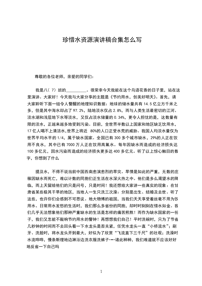 我是八(7)班的__________。很荣幸今天我能在这个鸟语花香的日子里,站在这里演讲。大家好!今天我与大家分享的主题是《节约用水,创美好明天》。首先,请大家聆听下面一组令人警醒的地理知识数据:地球的储水量共有14.5亿立方千米之多,但是其中海水却占了97.2%,陆地淡水仅占2.8%,而与人类生活最密切的江河、淡水湖和浅层地下水等淡水,又仅占淡水储量的0.34%,更令人担忧的是,这数量有限的淡水,正越来越多地受到污染。目前,全世界半数以上国家和地区缺乏饮用水,17亿人喝不上清洁水,世界上将近80%的人口正受水荒的威胁。我国人均淡水量仅为世界平均水平的1/4,属于缺水国家。全国已有300多个城市缺水,29%的人正在饮用不良水,其中已有7000万人正在饮用高氟水。每年因缺水而造成的经济损失达100多亿元,因水污染而造成的经济损失更多达400多亿元。听了以上惊心触目的数字,你想到了什么