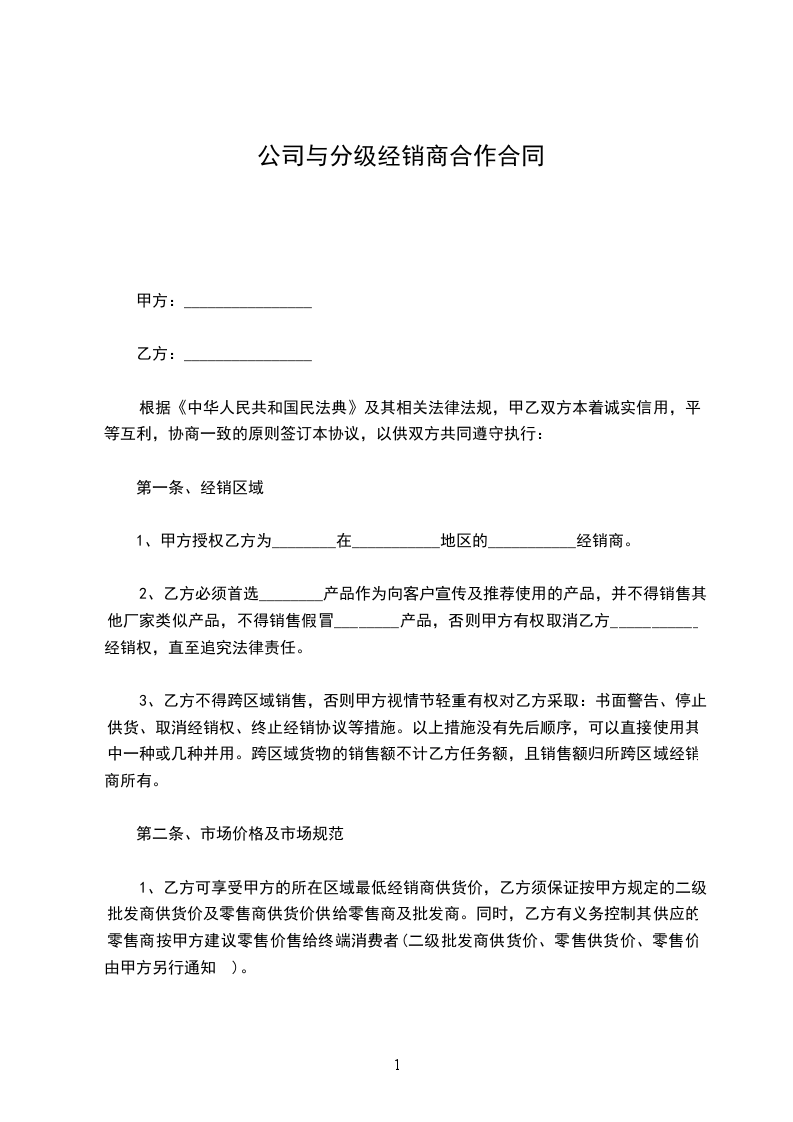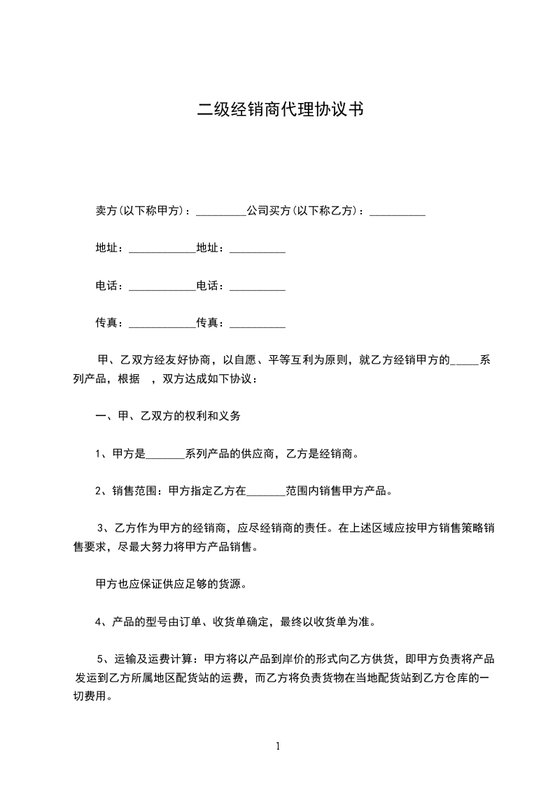 1、甲方授权乙方为________在___________地区的___________经销商。