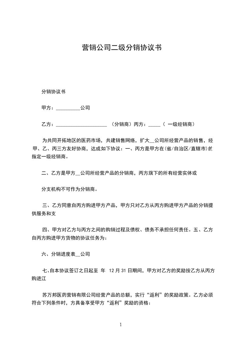 5、乙方应从协议签定之日起叁个月内,在所辖区域内建立____个以上的分销商(点),且每个分销商(点)必须具备符合甲方要求的展示区,且在经营过程中必须督导分销商(点)维护其形象。