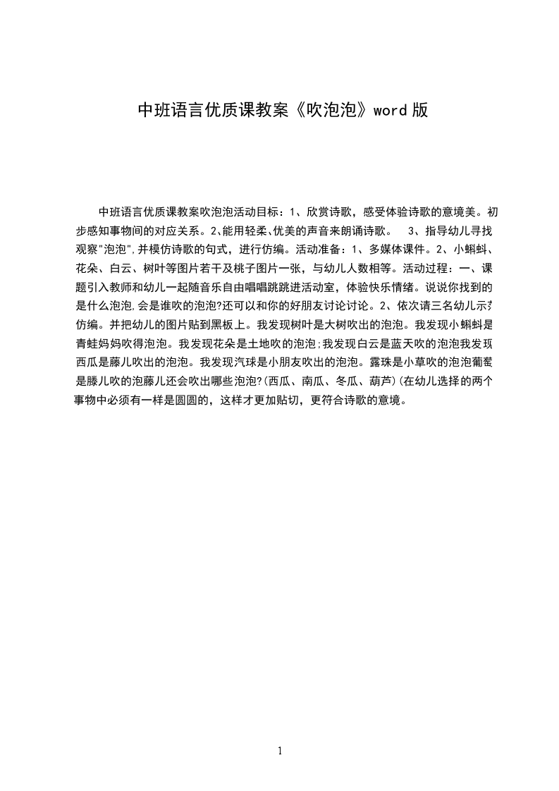 师:泡泡还可以飞到那么多的地方呐!现在让我们出去再玩一玩吹泡泡,看看泡泡还能飞到哪里去!附:儿歌——吹泡泡(儿歌经过改编)小朋友,吹泡泡,吹出许多大泡泡。小朋友,吹泡泡,吹出许多小泡泡。