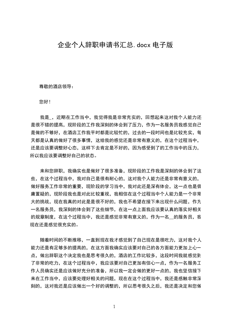 自从我进入了餐厅之后,由于你对我的指导和信任,使我获得了许多机遇和挑战。经过这段时间在餐厅的工作,我从中学到了许多知识,积累了一定的经验,对此我深表感激。由于我自身工作能力不足,近期的工作让我觉得力不从心,为此我作了很长时间的思考,我决定递上辞呈。
