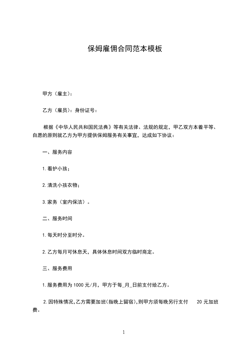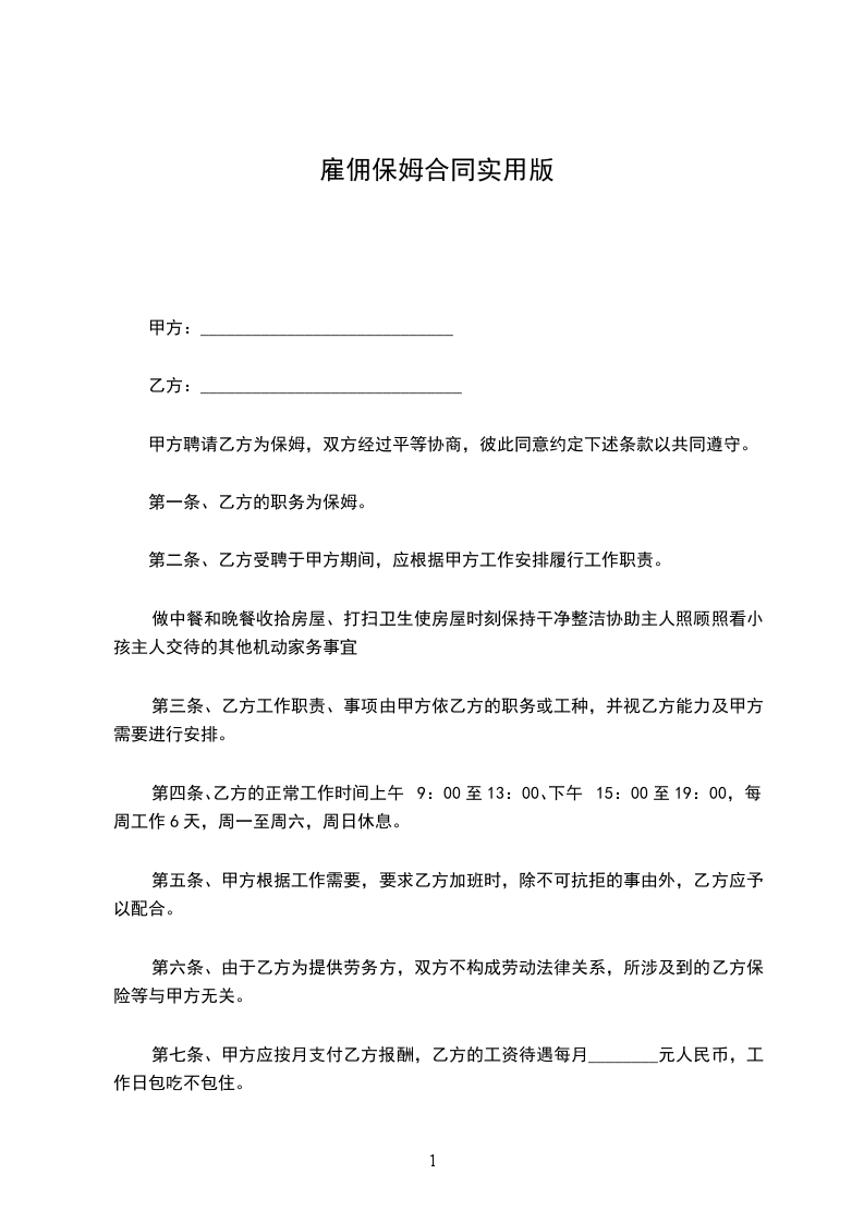 雇主为甲方:保姆为乙方: