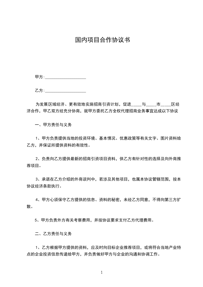 1、甲方负责提供当地的投资环境、基本情况、优惠政策等有关文字、图片资料给乙方,并保证所提供资料的有效性。