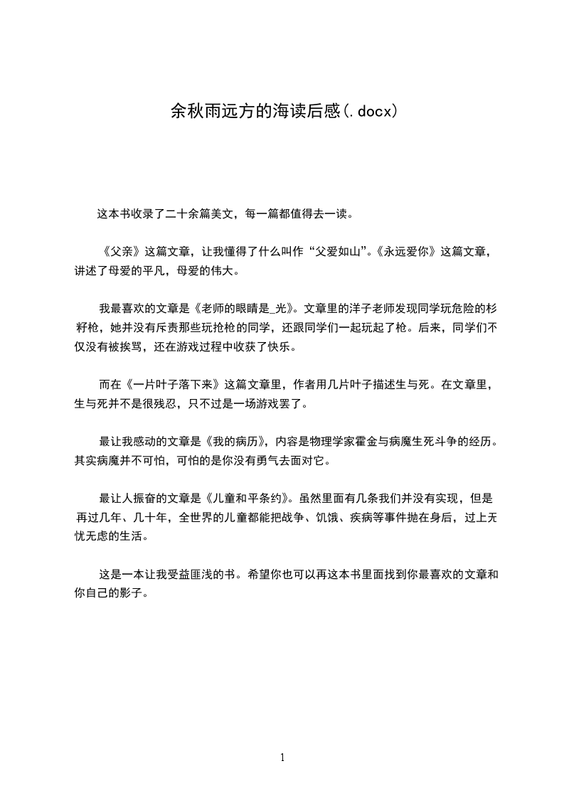 《父亲》这篇文章,让我懂得了什么叫作“父爱如山”。《永远爱你》这篇文章,讲述了母爱的平凡,母爱的伟大。