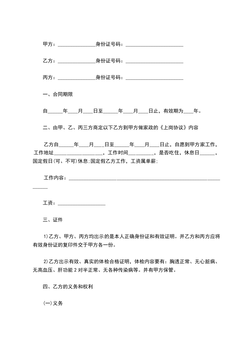 二、由甲、乙、丙三方商定以下乙方到甲方做家政的《上岗协议》内容
