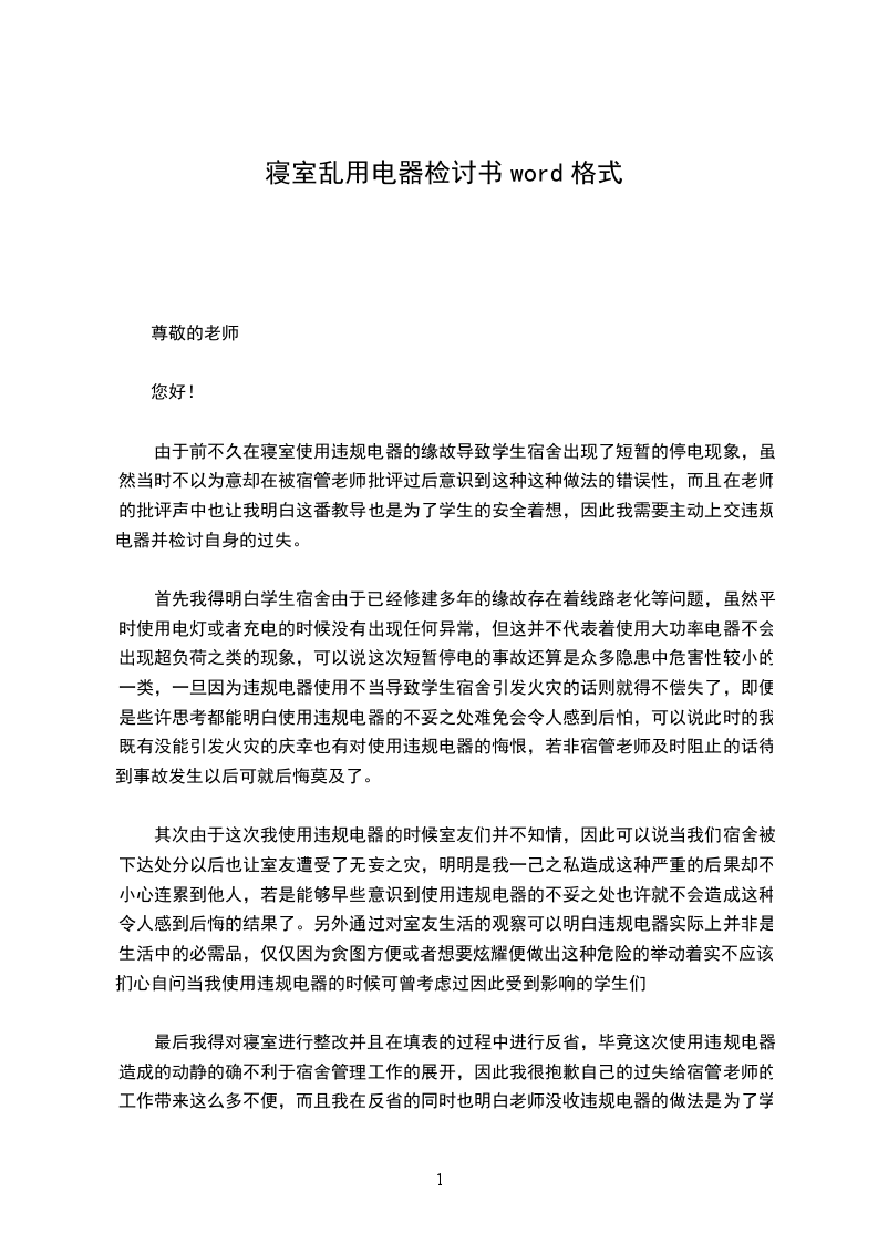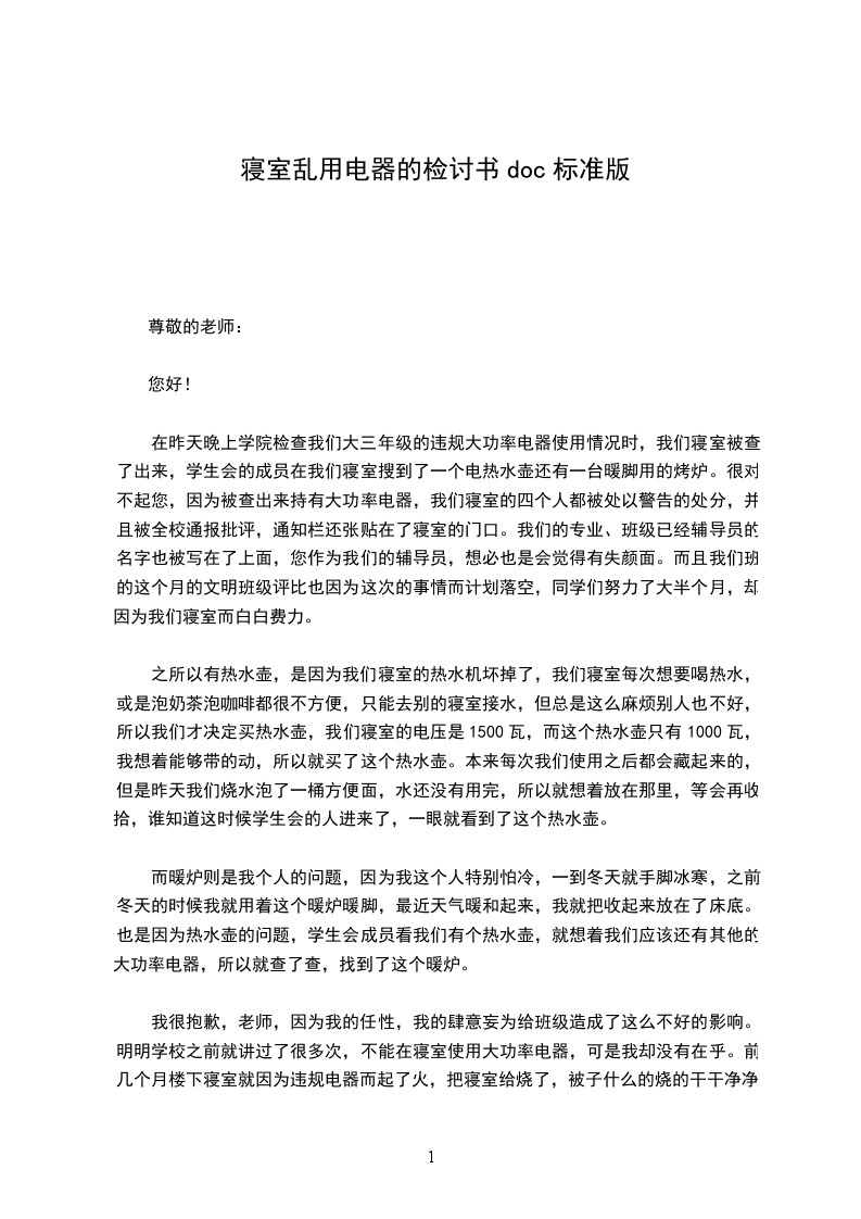 我由于没有按照宿舍管理条例的要求,将电用器拿到寝室使用。为寝室的安全带来了很大的隐患。通过学习宿舍安全管理条例细则。我深刻意识到自己犯的错误的严重性。我这是有悖合格大学生的行为,其结果损害了多方利益,在学校造成极坏的影响。在此,我郑重表示歉意。