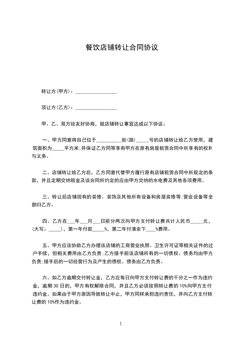 一、甲方同意将自己位于__________街(路)_____号的店铺转让给乙方使用,建筑面积为_____平方米;并保证乙方同等享有甲方在原有房屋租赁合同中所享有的权利与义务。