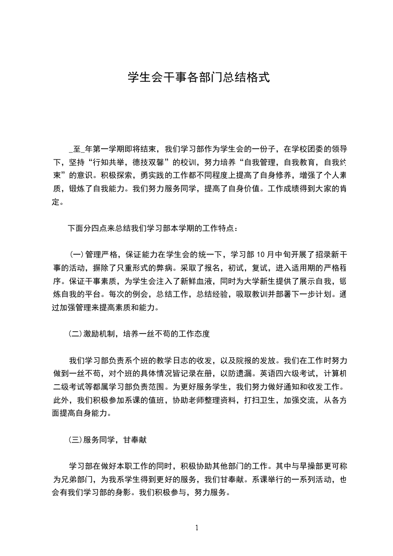 我叫 ,来自__系__专业__班。一年前加入宣传部并担任部门__干事一职。我的性格比较沉稳,出事果断,能够顾全大局。在过去一年的学生会工作中,积累了多方面的工作经验,熟知部门的工作流程,积极认真完成每一次工作,在工作中提高了自身的文学素养。