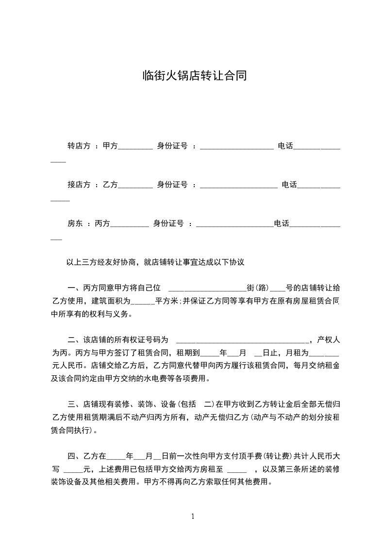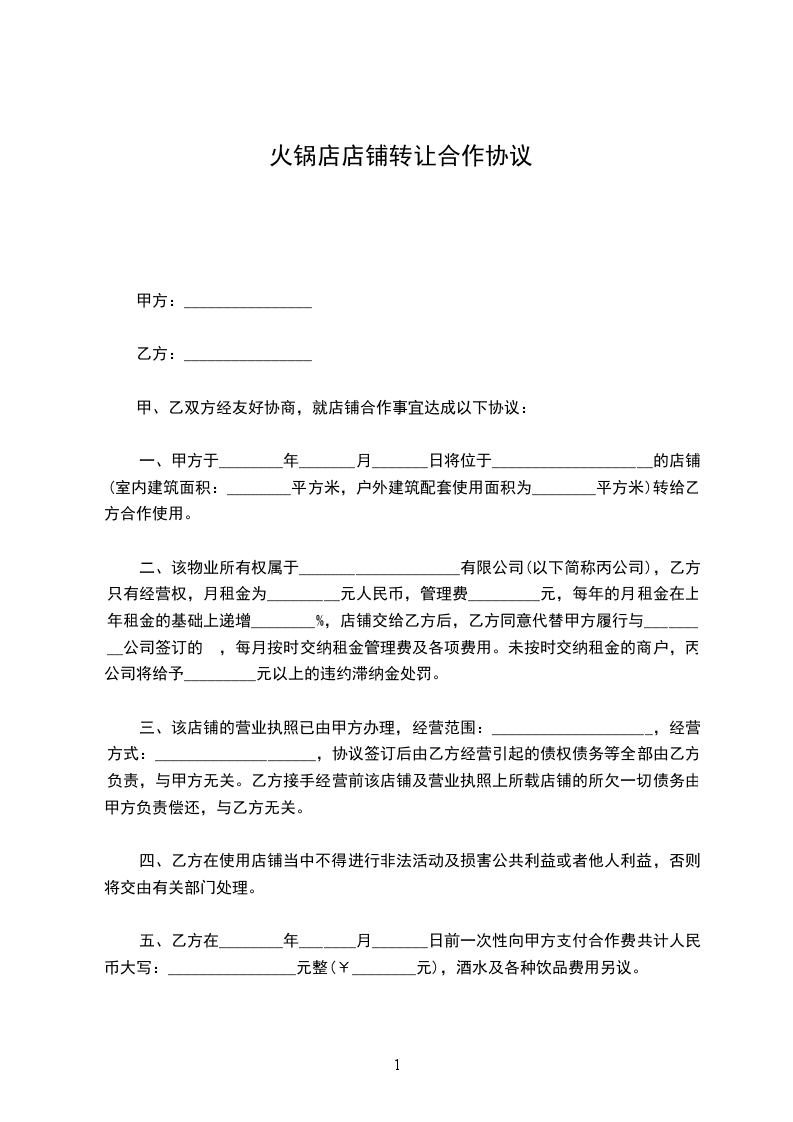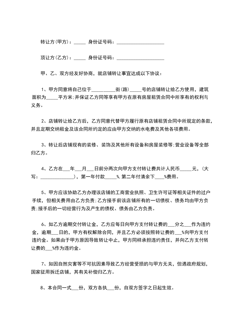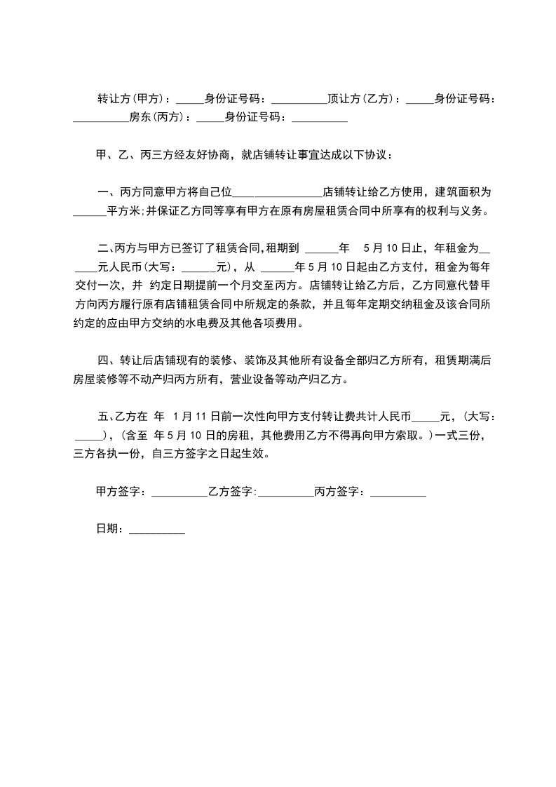 1、甲方同意将自己位于__________街(路)_____号的店铺转让给乙方使用,建筑面积为_____平方米;并保证乙方同等享有甲方在原有房屋租赁合同中所享有的权利与义务。