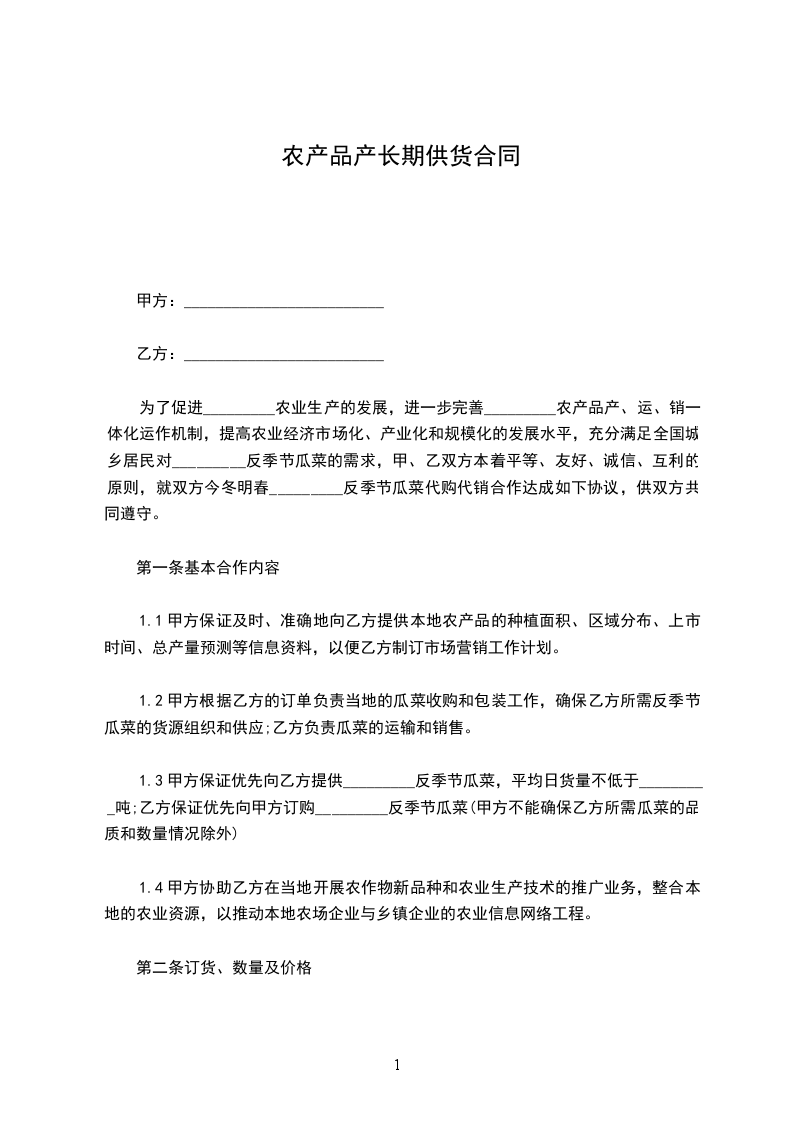 为了促进_________农业生产的发展,进一步完善_________农产品产、运、销一体化运作机制,提高农业经济市场化、产业化和规模化的发展水平,充分满足全国城乡居民对_________反季节瓜菜的需求,甲、乙双方本着平等、友好、诚信、互利的原则,就双方今冬明春_________反季节瓜菜代购代销合作达成如下协议,供双方共同遵守。