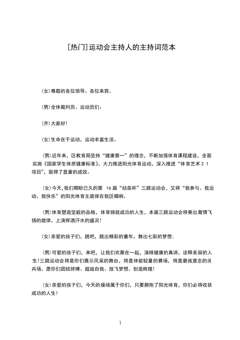 (男)可爱的孩子们,来吧,让我们欢聚在一起,演绎健康的真谛,诠释美丽的人生!三跳运动会将是你们展示风采的舞台,将是体能较量的赛场,将是磨练意志的阅兵场。愿你们团结拼搏、超越自我、放飞梦想、创造辉煌!